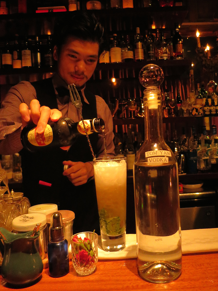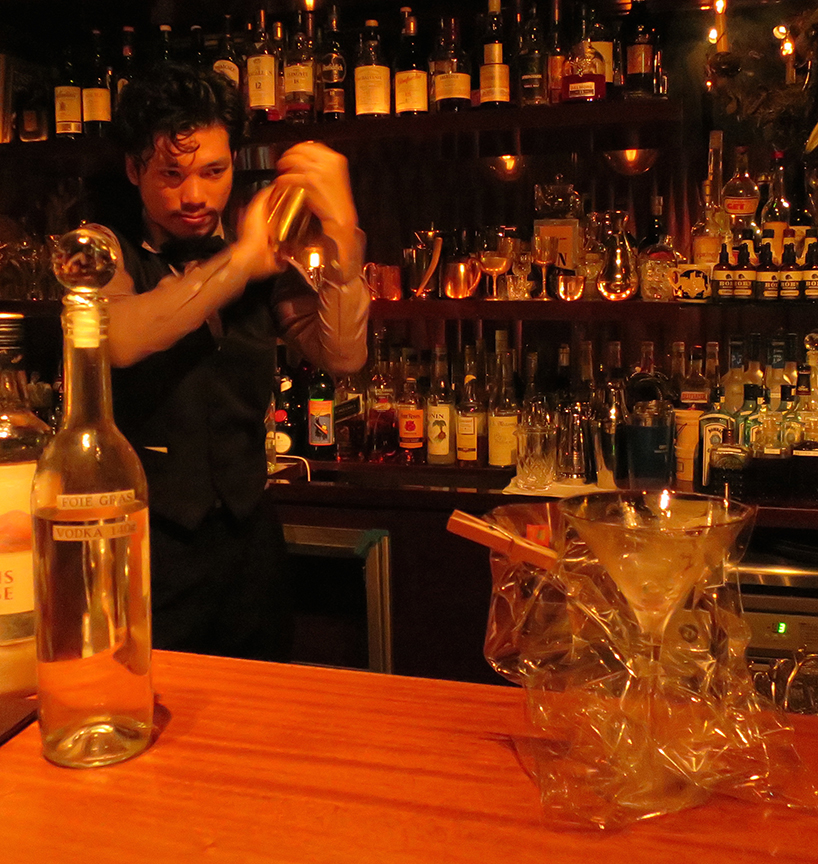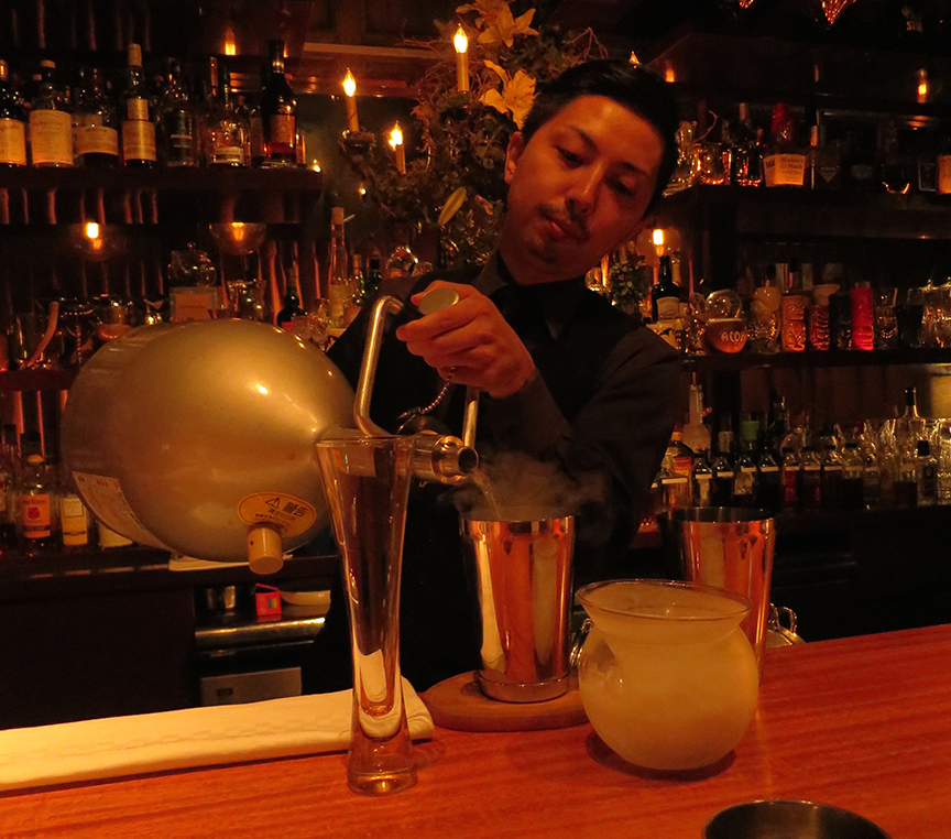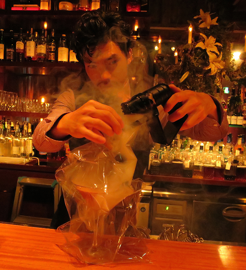 One of the things I especially like about this bar is that most of the cocktails don’t knock you under the table, so you can try (or share) more than one. They’re pretty pricey (¥1500-¥1800) but if you consider that the experience includes the entertainment of watching it made plus the pleasure of sitting in a really nice place drinking something you couldn’t get anywhere else in the world, it actually seems like kind of a bargain…