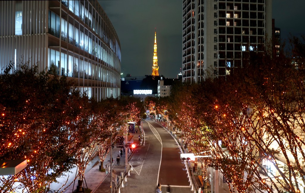 Over at Roppongi Hills, Keyakizaka-dori’s avenue of lights is always beautiful. The best place to see the promenade (and get a view of Tokyo Tower) is from the bridge over the street by the Louis Vuitton store.