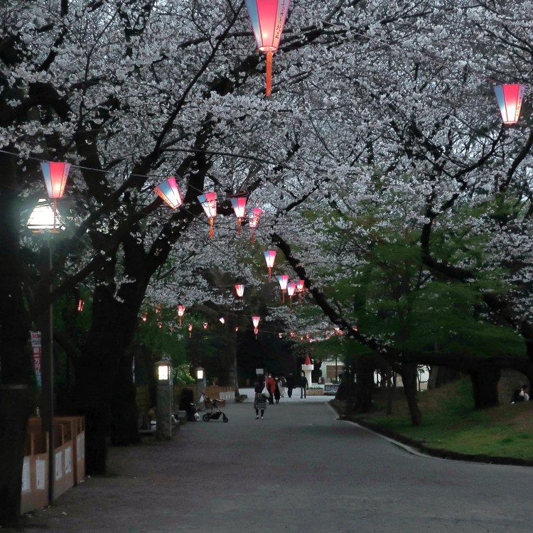 and lanterns strung through the trees invite everyone to enjoy themselves at hanami parties in the evening.