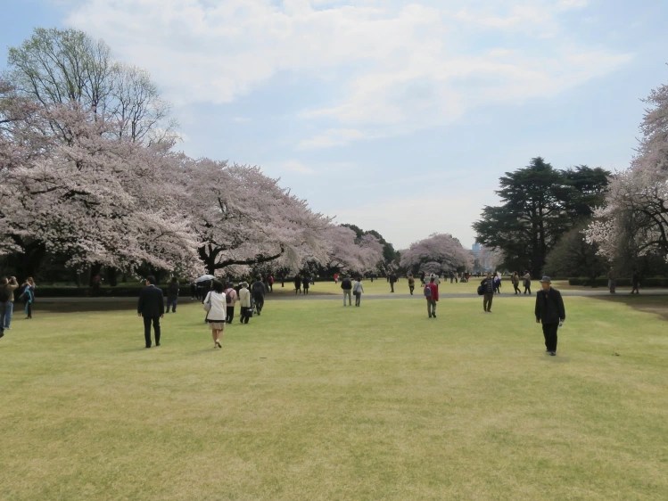 The classic somei yoshino variety bloom after that, inviting visitors to stroll down the central lawn…