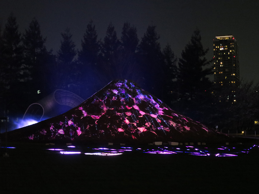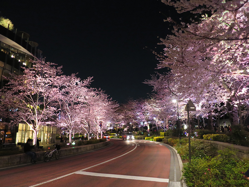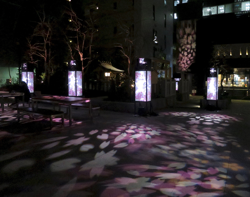 While it can’t quite compete with the psychedelic Mt. Fuji, the cherry-challenged shopping district of Nihonbashi does pink itself up at night with some animated cherry petals & such. Just beyond the Coredo 2 building, you’ll come to an outdoor pass-through that greets you with swaths of billowing pink chiffon above and ever-changing patterns of cherry-themed projections below.