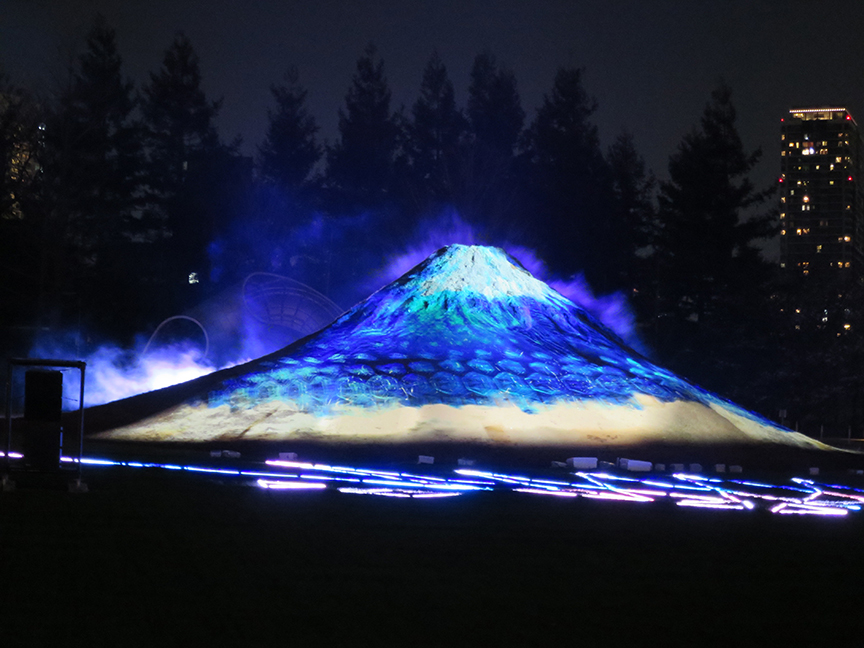 …they also dumped a huge cone of dirt on the field where the illuminations happen in wintertime, and topped it with some funny-shaped bushes. During the day it’s completely WTF-am-I-looking-at, but at night…this.