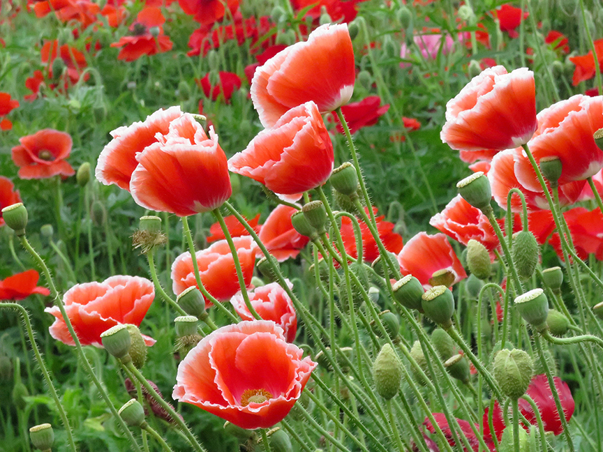 Note: The poppy fields are a bit of a hike from the main entrance, and not well-marked. Find the entrance to the Japanese garden, then follow the paved path outside it to the right, skirting around the walled area until you come to a wide path branching off to the left. Follow that around the copse of trees to the same fields where the purple cosmos bloom in the fall.