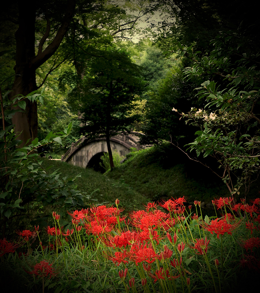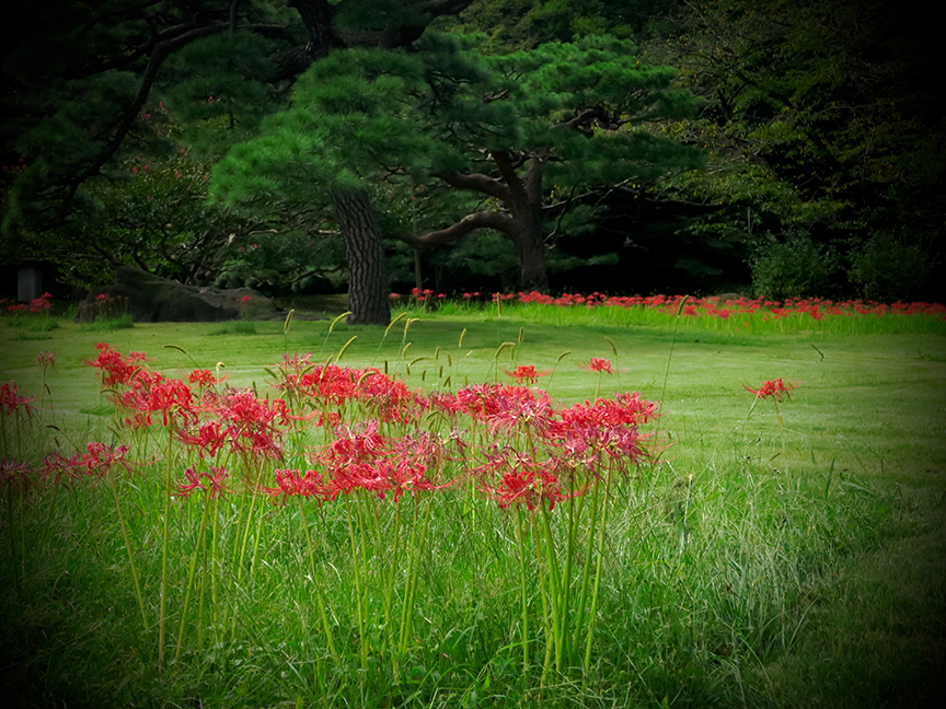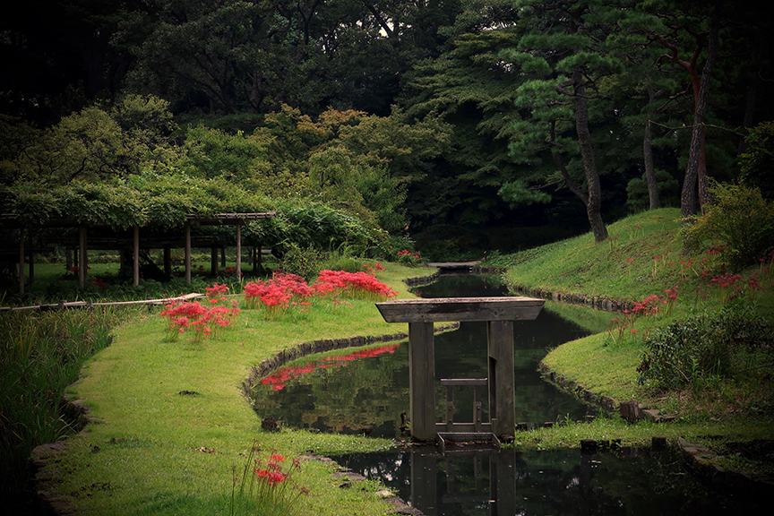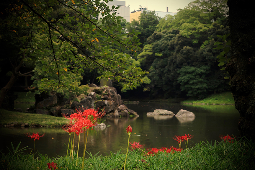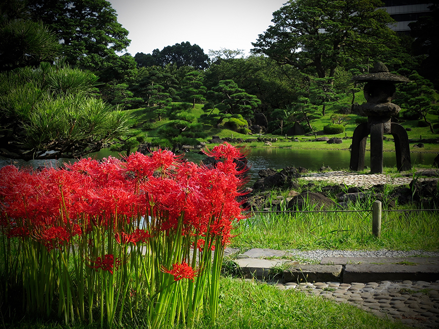 Exuberant stands of higanbana burst from the deep green in this little-known stroll garden, right next to Hamamatsucho Station