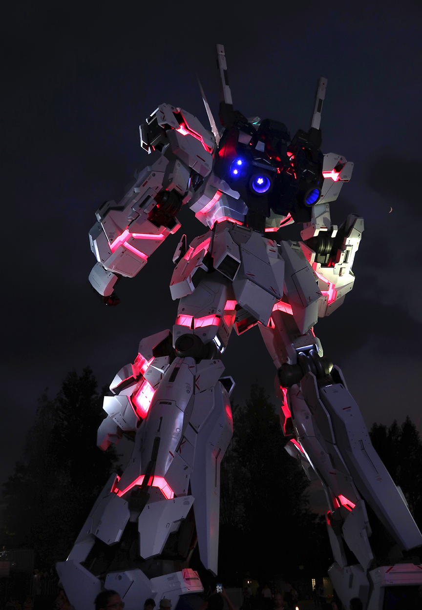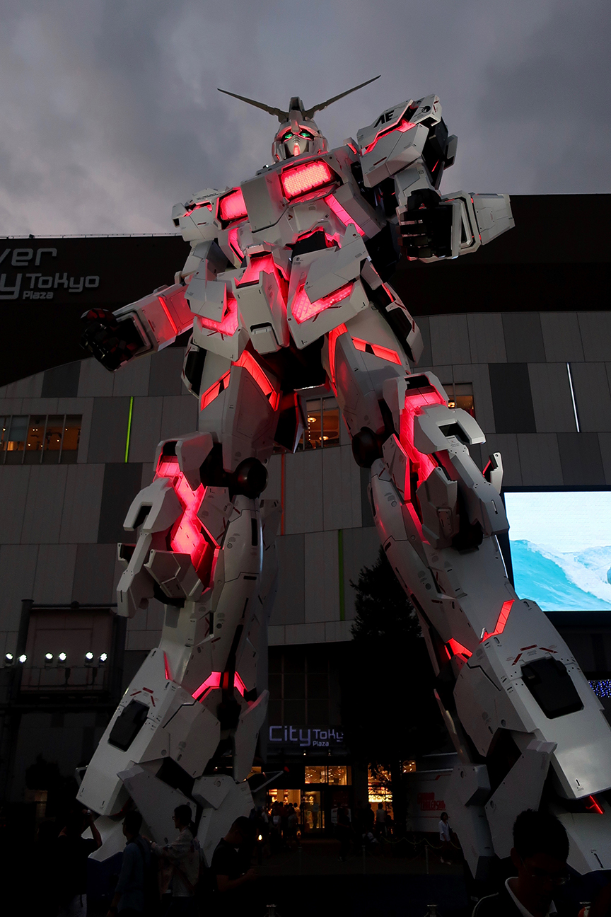 But it’s not enough for 2.0 to be standing there, looking like it could take on the galaxy with one armored fist tied behind its back – there’s also a sound & light show that goes with it! Eight times a day (at 11:00, 13:00, 15:00, 19:30, 20:00, 20:30, 21:00 & 21:30) there’s a five-minute anime episode choreographed with projection mapping, as the giant figure shifts along with the story.