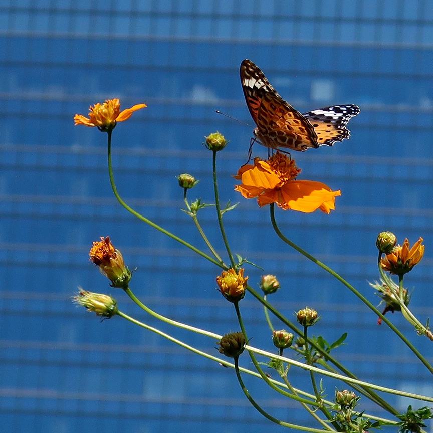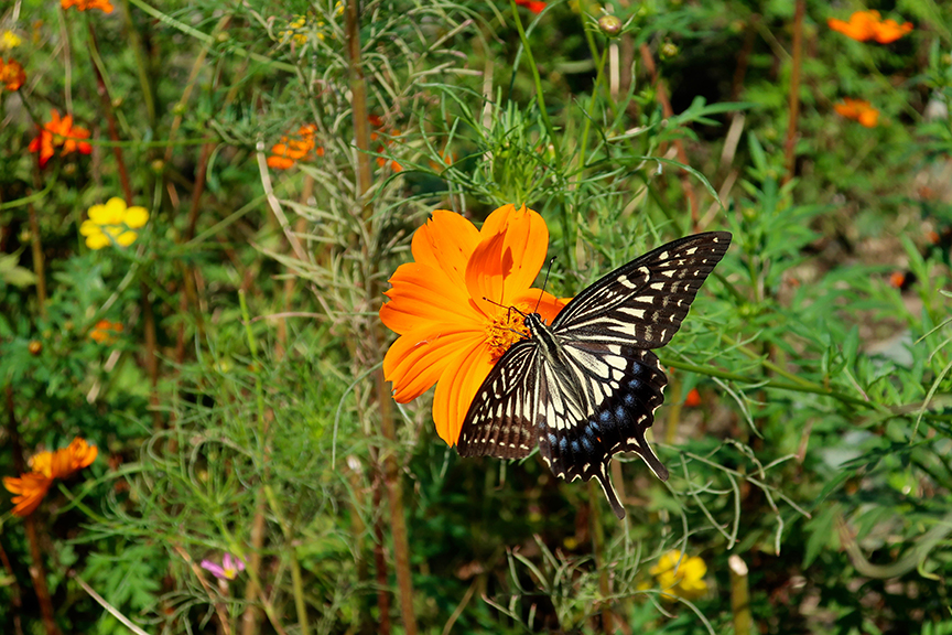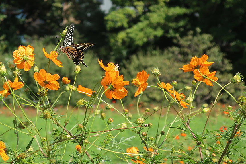 Went to check on whether the cosmos were blooming yet at Hama-Rikyu Teien garden last week and discovered that the lovely fields of gently nodding multicolored blooms I remembered were looking vastly overgrown and (honestly!) kind of ratty. I was about to stalk away muttering, “Disappointment, thy name is Hama-Rikyu” when the corner of my eye caught a fluttering.