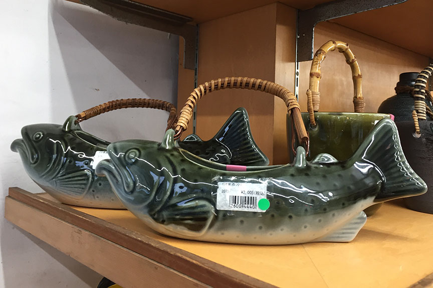 Nothing goes together better than drinking and fishing, and this sake flask will ensure that every whopper that got away gets bigger with the telling. (From the big open-fronted pottery store across Kappabashi Street from the chef’s head, in the middle of the first block.)