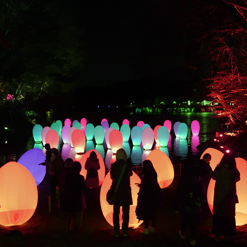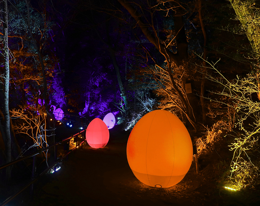 Once you get into the forest, the path is lit by the eggs and trees, in a kaleidoscope of changing hues influenced by visitors walking among them. The natural forms of the trees and bamboo become intricate designs in the dark