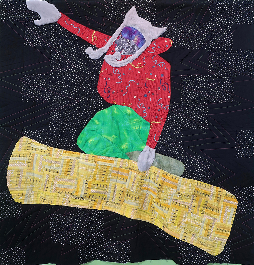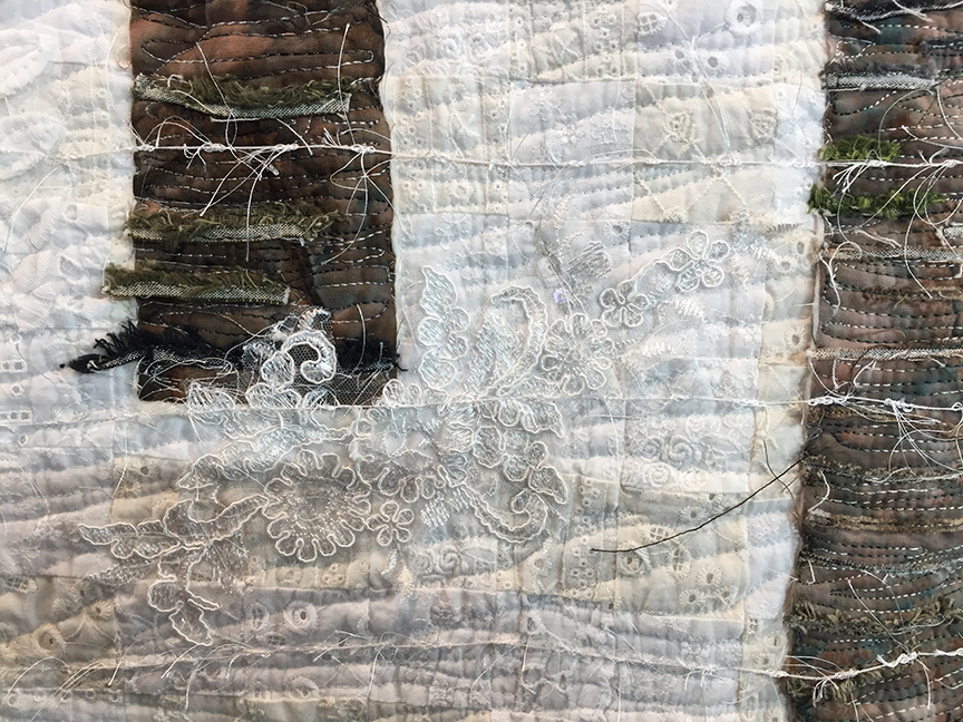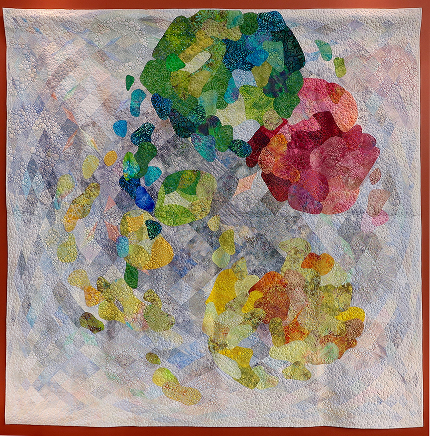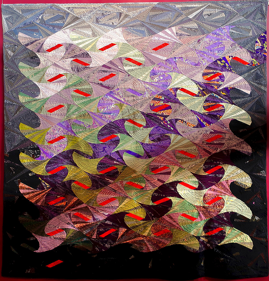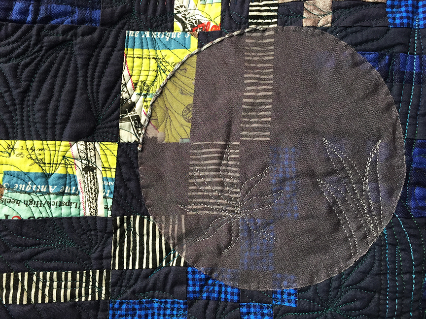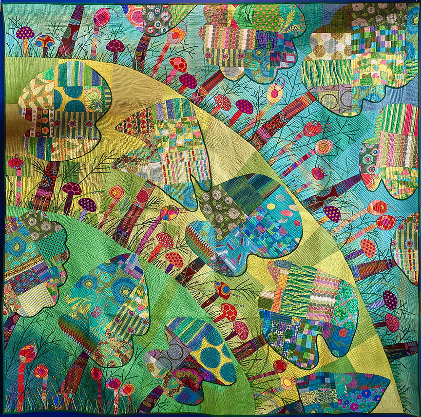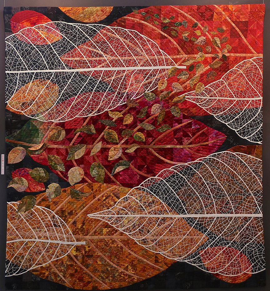 This is one of the most inventive “autumn” themed quilts I’ve seen, focusing on what happens after the leaves fall. The skeletal ones are composed of hand-appliqued fabric ribs and endless embroidery.