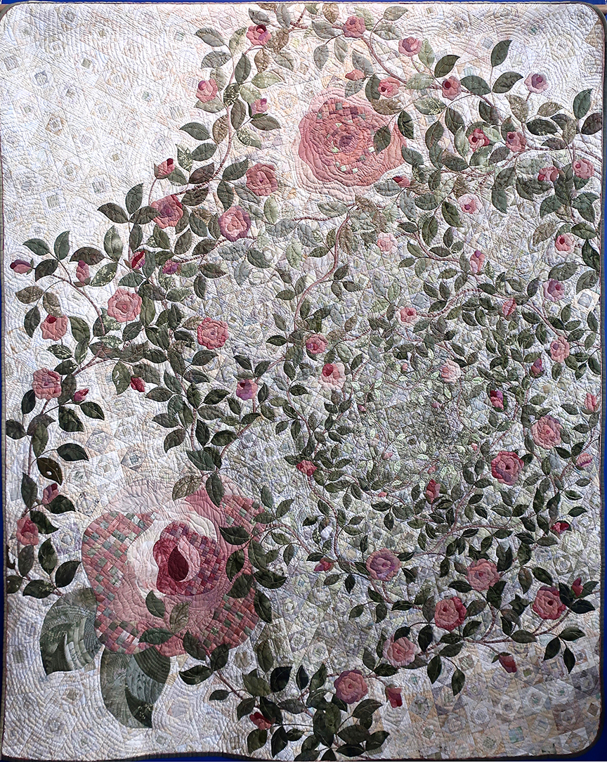 I really enjoyed how this next quilt deconstructs a traditional rose motif, unspooling it and playing with scale and orientation. And look how she has “pixellated” some of the elements: