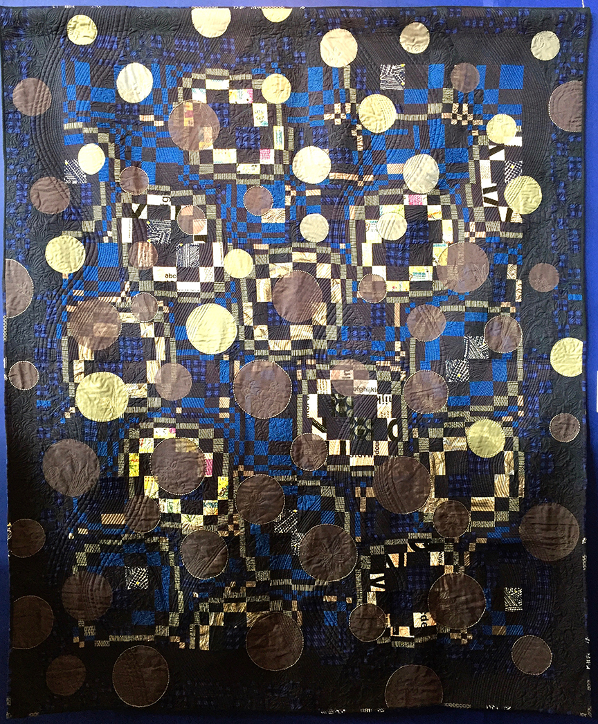 This quilt took first place in the “Japanese” theme category. At first, it seems like a strange choice because it doesn’t exhibit insanely skilled traditional quilting chops like the other entries. What it does show in spades is the long rural history of reusing “boro-boro” rags to make things of beauty, and how raw edges and random shapes and imperfection can come together to make something that can be lovelier (in a different way) than those that are meticulously planned and executed.
