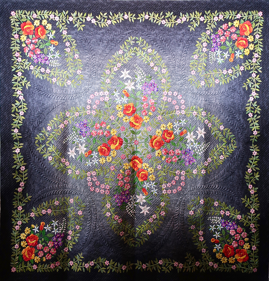 There were a number of quilts made with traditional patterns, but very untraditional colors. Isn’t it amazing how different this floral pattern looks with a dark background, rather than the usual white?