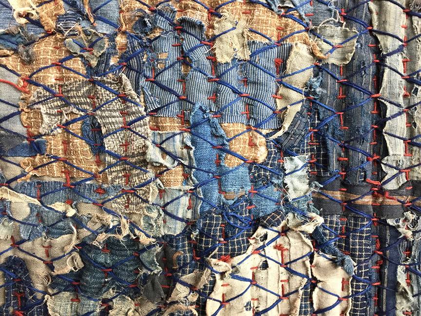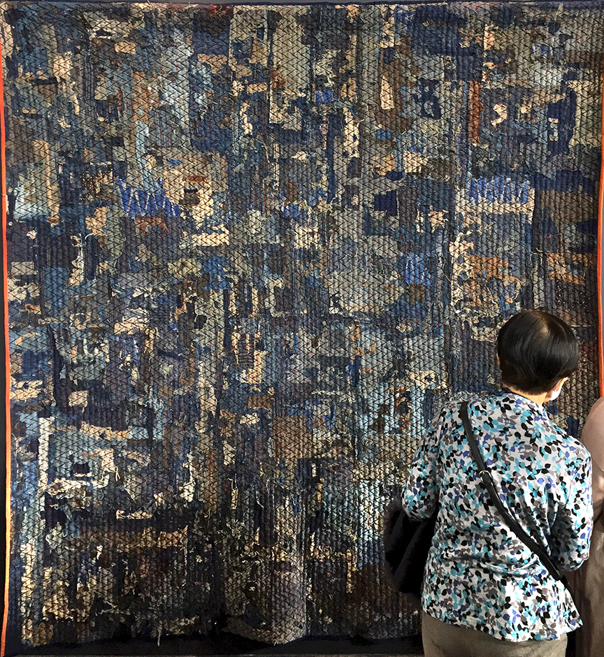 This next one is a tour de force of optical art. The farther away you stand, the more organized the pattern looks. Up close, it seems to be a pleasing, random patchwork of Japanese indigo patterns. Step away a little farther, and you notice the diagonal squares and the “basket weave” created by alternating similar patterns and colors. And from across the room, the central square swims into glorious focus.