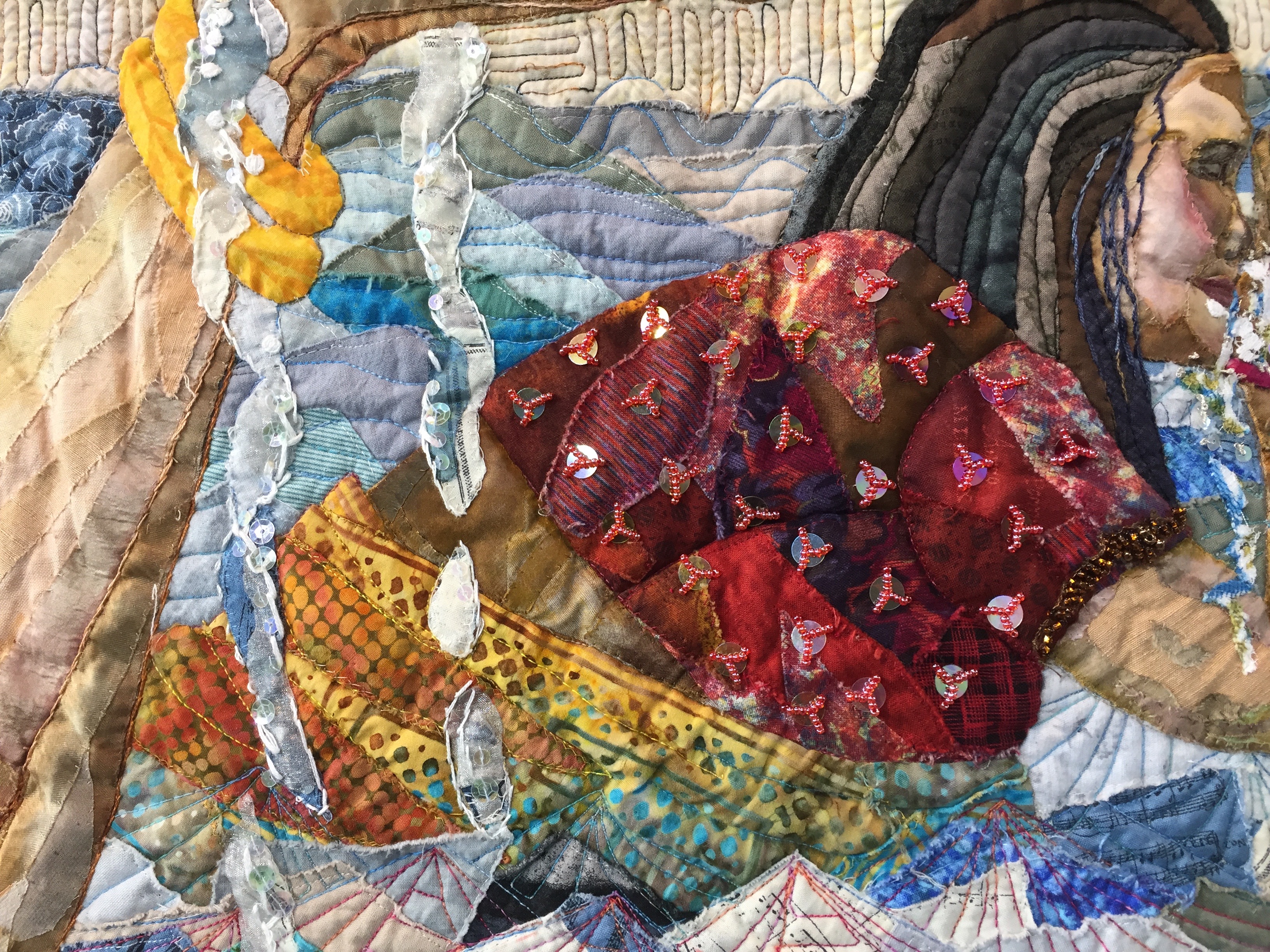 There were a couple of quilts in this show that were masterpieces of stitching rather than piecing. This landscape was handpainted, then intricately quilted, using thread colors to create subtleties of light and shadow.