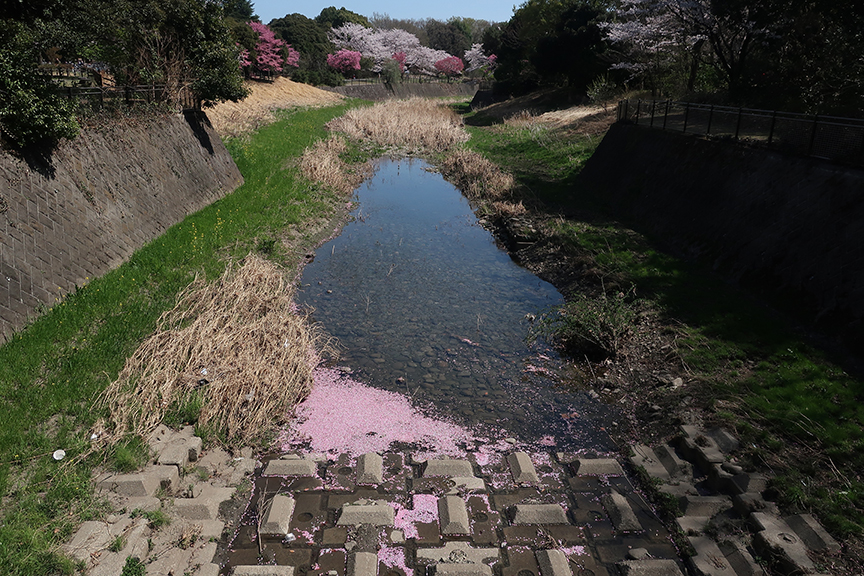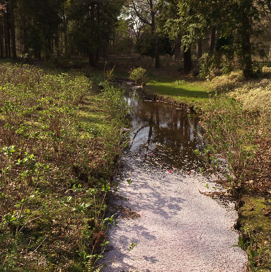 …but you can see its potential in this photo, where the fallen petals have caught in the eddies. I’m told that if you luck into a period of no rain, it does become a delightful river of pink