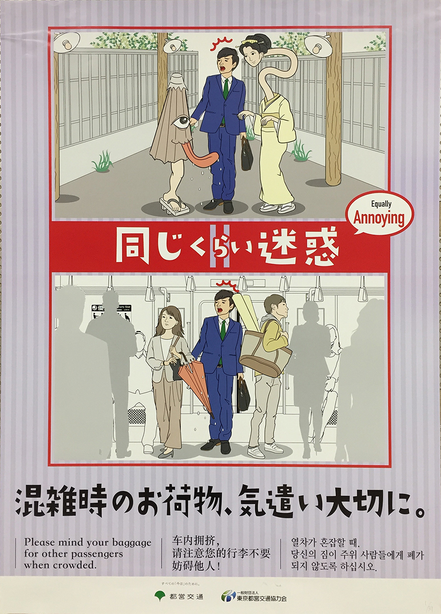 I’m afraid this subway manners poster isn’t going to do much to convince Things That Go Bump In The Night to stop harassing passengers – in fact, it’ll probably infuriate them to learn that they are merely as annoying as a wet umbrella or an overstuffed backpack, thus triggering a supernatural reign of terror.