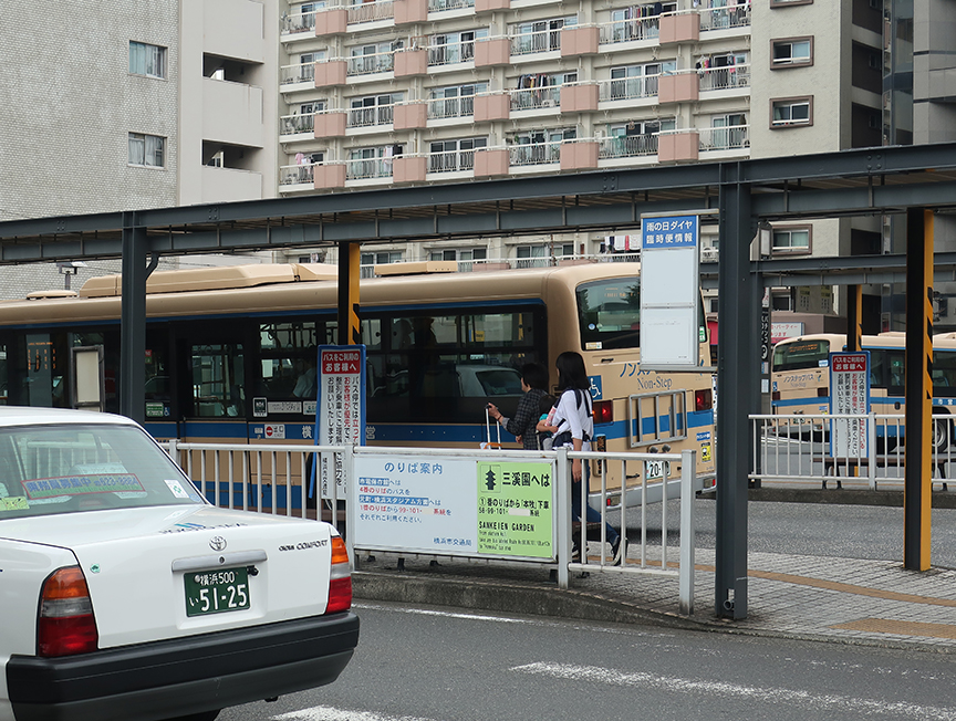 • Outside the Negishi train station exit (there’s only one), you’ll see an array of bus stops. The first one to your left is where to catch the buses that stop nearest Sankei-en. The shelter is clearly marked, like this: