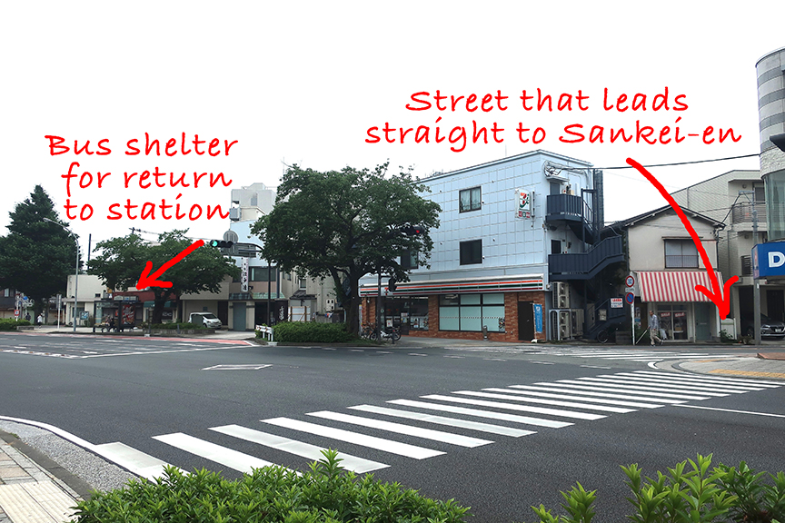 When you get off at Honmoku, you’ll be at a big intersection. From the corner you can see the street you’ll walk down to reach Sankei-en, and also the bus shelter for your return to the station.