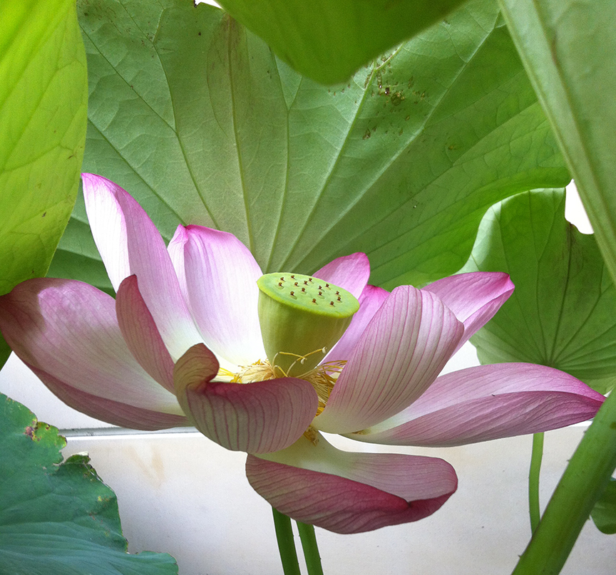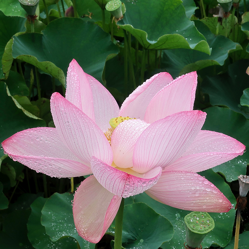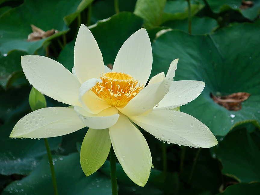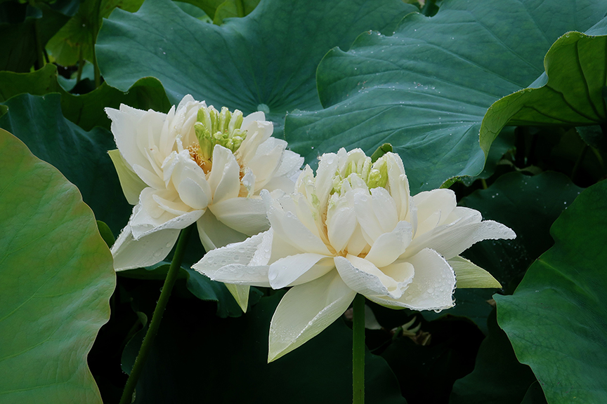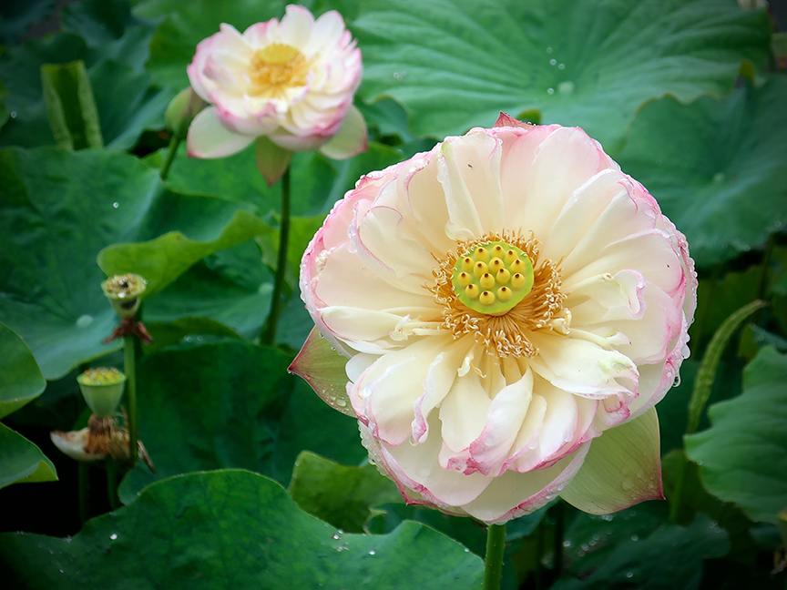Lotus flowers open at first light, are at their best from about 7:00 to 9:00, then they close up again, so it pays to strap on your alarm clock and be up with the birds if you want to see them at their finest. But they bloom rain or shine, and they’re the one flower that’s always more beautiful in the rain. They start blooming in mid-July, and keep on ’til mid-August, so there’s plenty of time to get out and catch a little heavenly bliss.