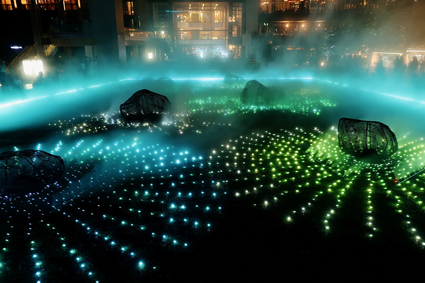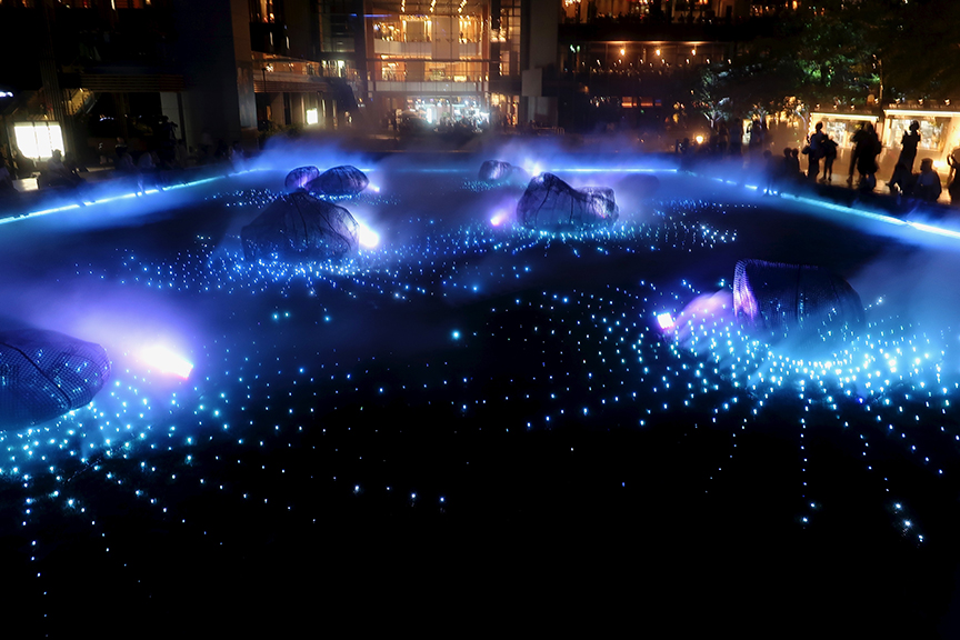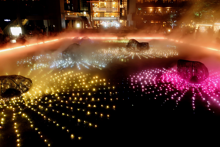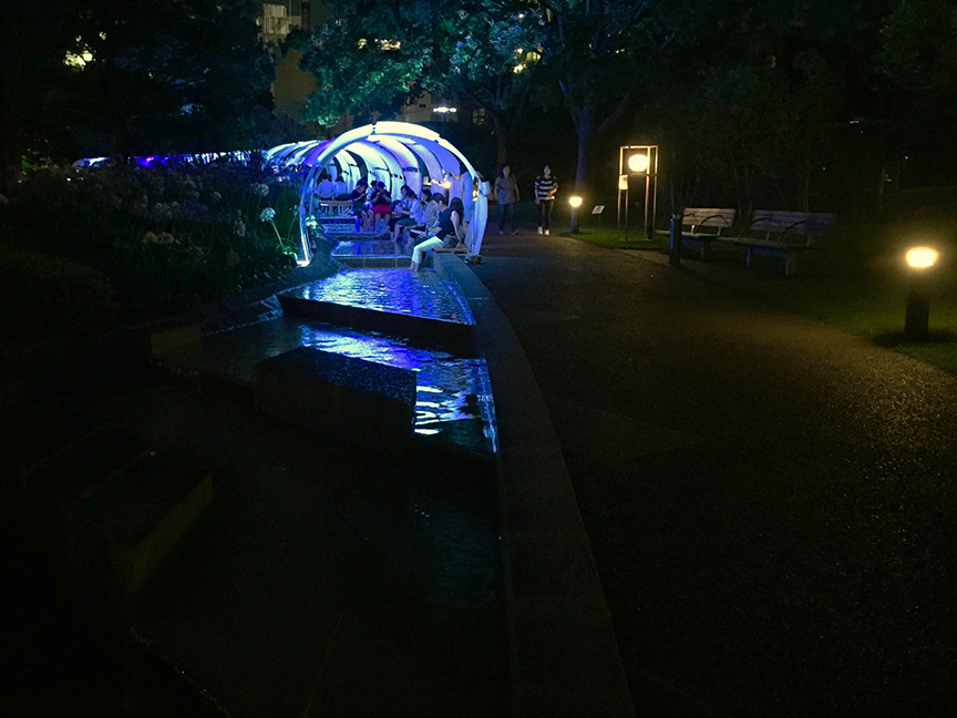 On the lawn that hosts those amazing winter illuminations, they’ve constructed a wide wooden veranda enclosing a “rock garden,” complete with clouds of mist and a fireworks-themed lightshow. And the best part is, you can sit and dangle your feet for as long as you like, enjoying the cool and the entertainment for free!