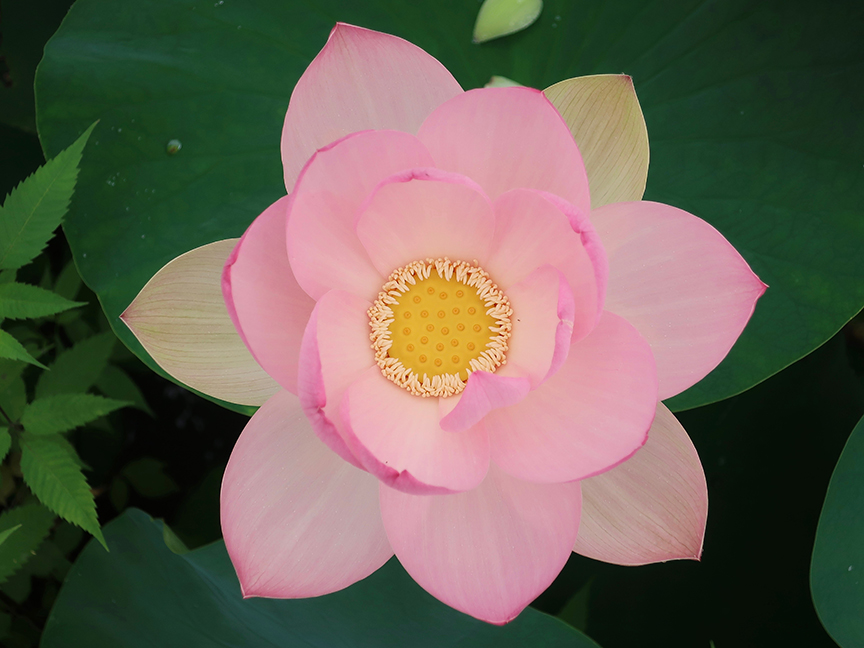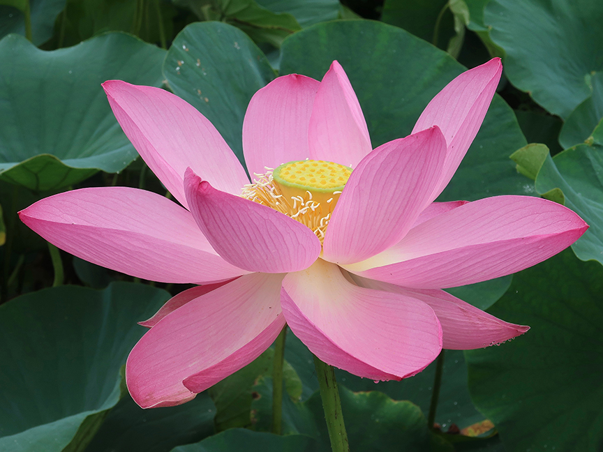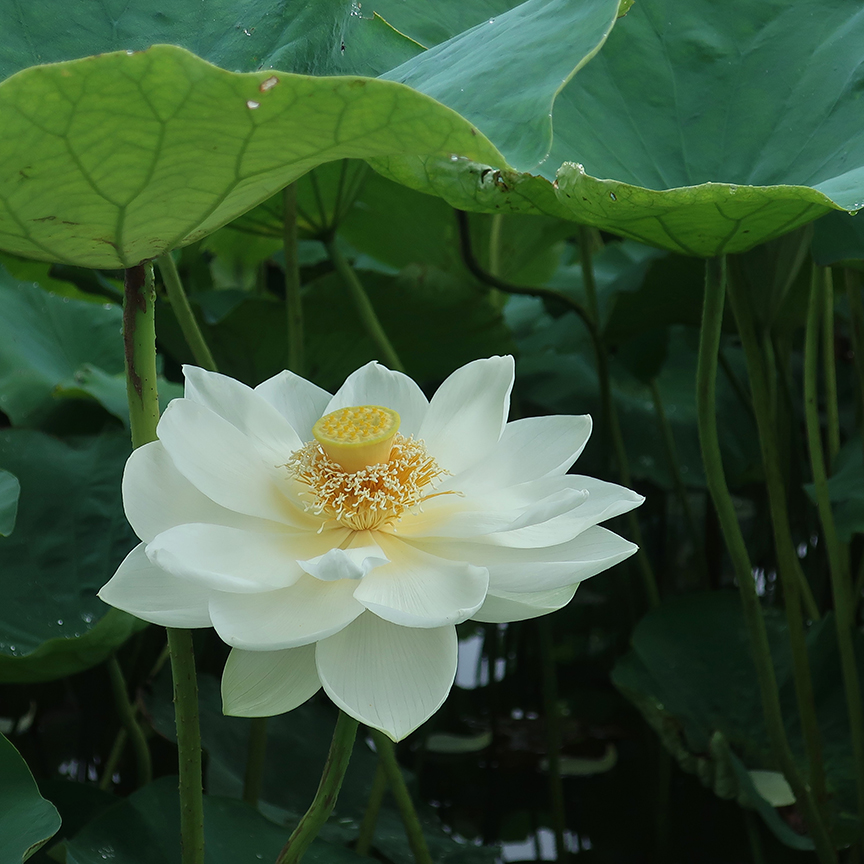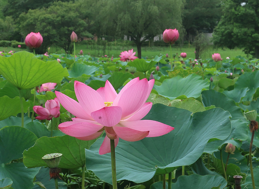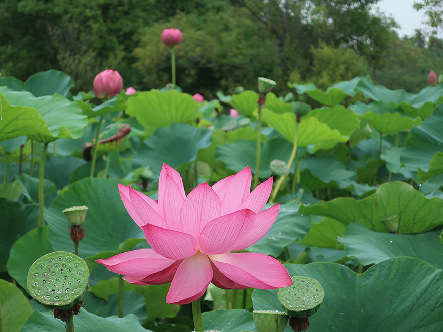 And the exhibit inside the ground floor of the tower is stuffed with interesting lotus facts. Like, they not only bloom at sunrise and close up by noon, they bloom differently on each day! On the first day, they only open up a little (like the one sticking up above the leaves in this picture), on the second day, they open up wide (like the one at the bottom of the photo) and on the last day, they go all out and drop their petals, making way for the seed pods to raise their many-eyed heads
