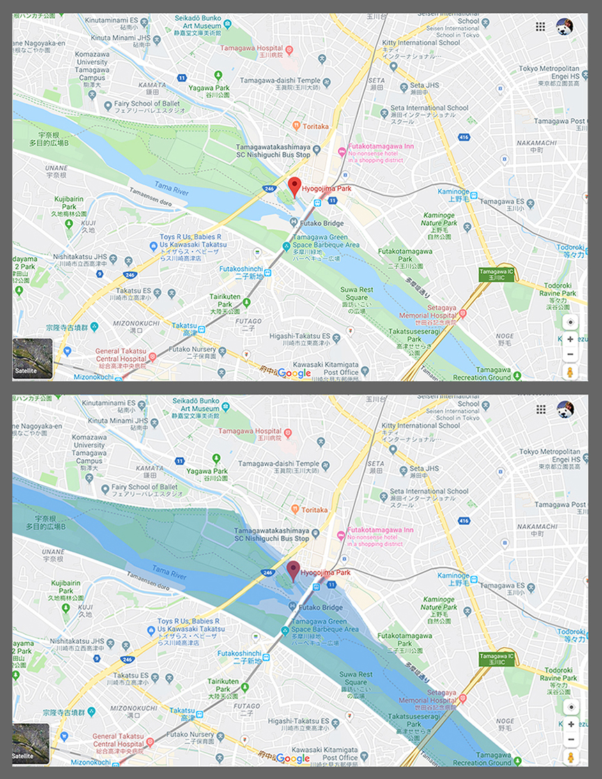 The top map (below) is what the sleepy Tama-gawa is usually like – a narrow band of water, lined with parks and soccer fields, picnic grounds and baseball diamonds. On the bottom is how it looked during the typhoon. The river spread out to its farthest banks, and then some, flooding basement apartments and shops along the street that runs alongside it.