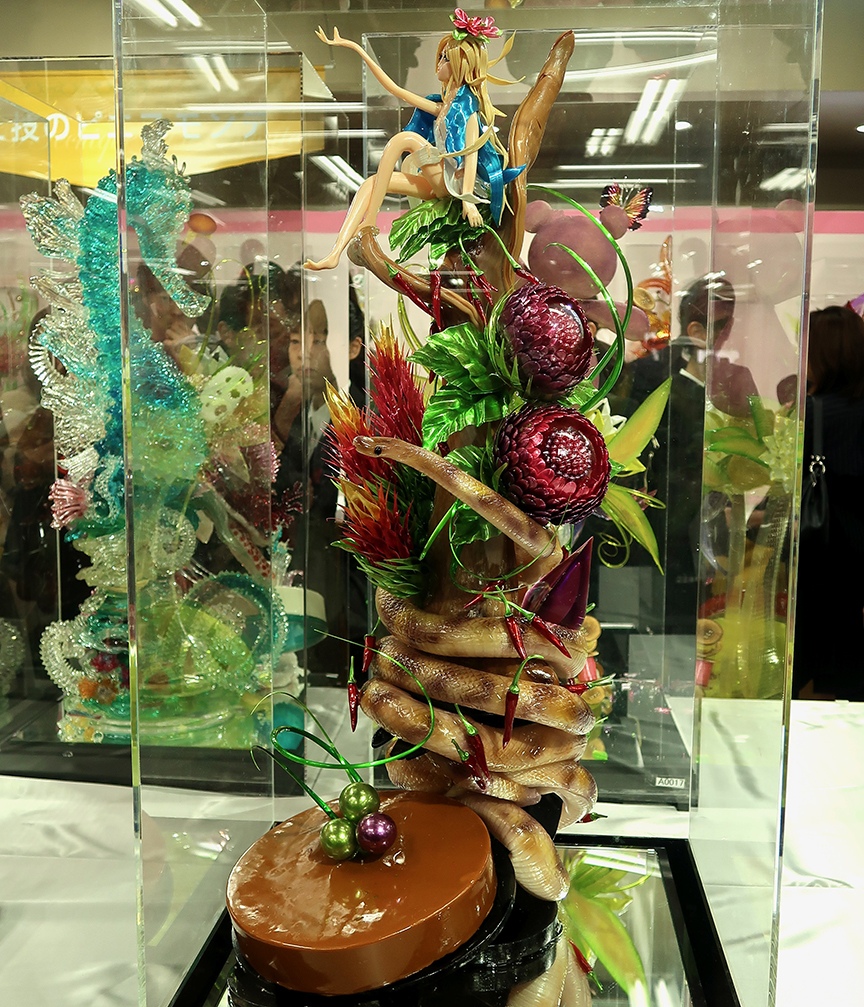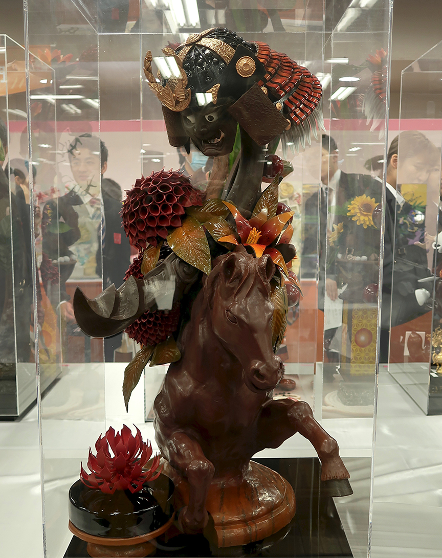 But the Japanese themes didn’t stop with the cakes – check out these king-sized decorations made of chocolate. And when I say they’re big, I dare you to find the normal-sized cake layer included in the design so these could remotely qualify as something you’d expect to see at a cake show. Makes those birthday cake roses I always coveted (DON’T JUDGE) look positively restrained.