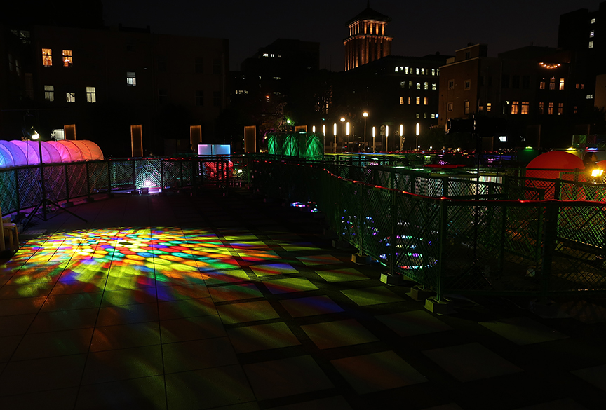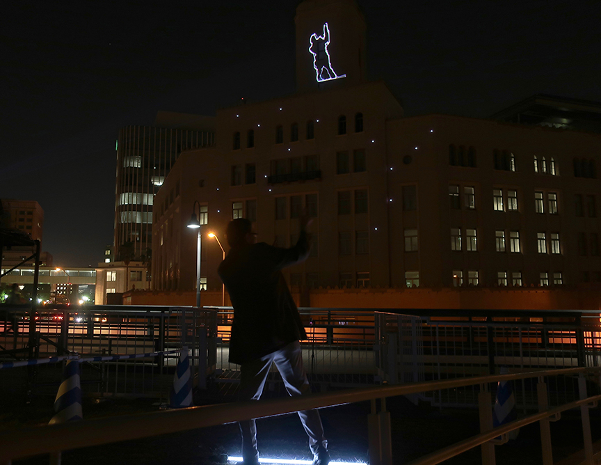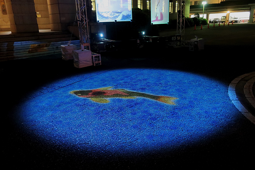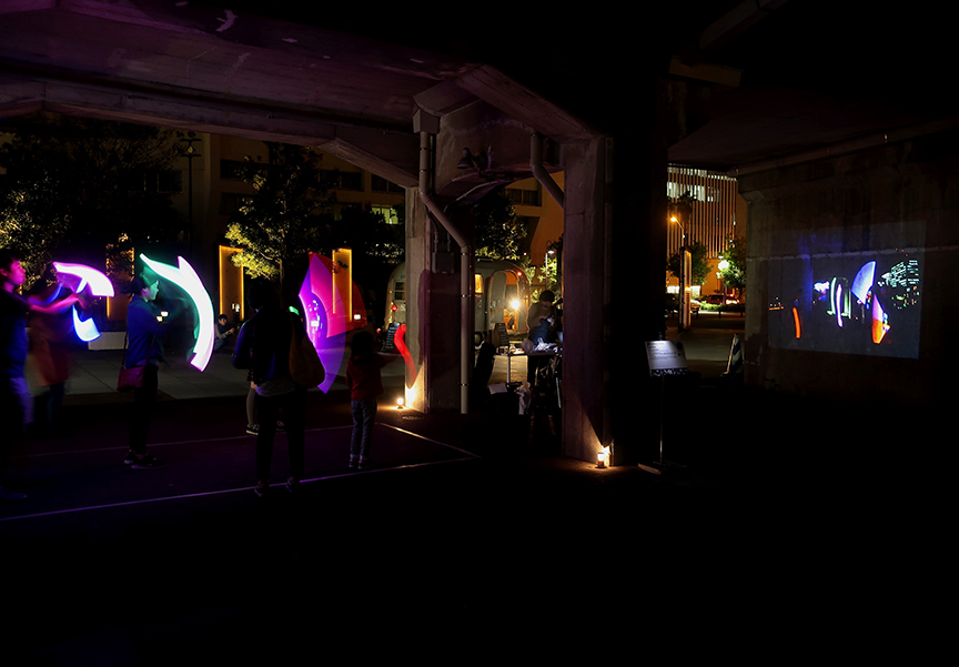 The building projection this year also rewarded movement – standing behind a light bar on the ground and dancing/jumping/waving projected a capering outline onto the nearby tower (Artist: Mitsuru Takeuchi)