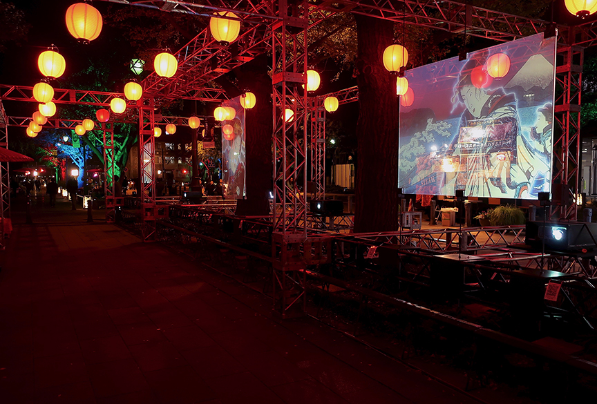 Even the walk from the subway station is entertaining – the lanterns brightening this promenade winked and shone in an ever-changing pattern, while animated ukiyo-e prints flickered on the adjacent screens