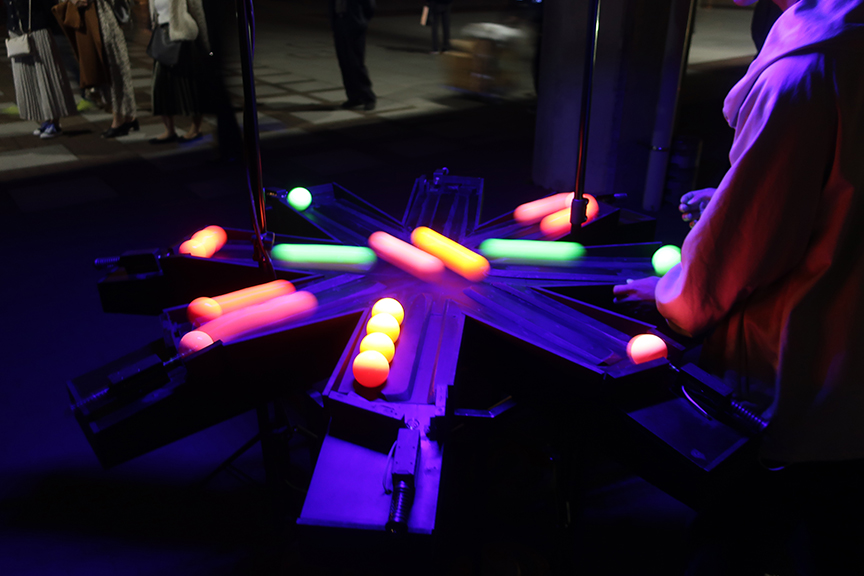 This one might have been designed for audience participation at first, but watching the artist launch the balls four at a time in a way that their increasingly complex motion didn’t result in any collisions requires such split-second timing that ordinary folks would have been able to launch about five before it all got derailed. It was super-mesmerizing to watch, though! Short clip below (Artist: Shun Onozawa)