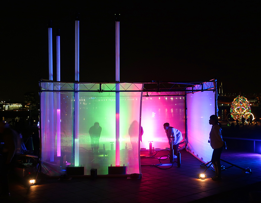 And this “pump room” pitted four participants against each other, trying to be the first to raise the glowing liquid in their tube to the top (Artists: Daisuke Matsumoto + Hisashi Harada)