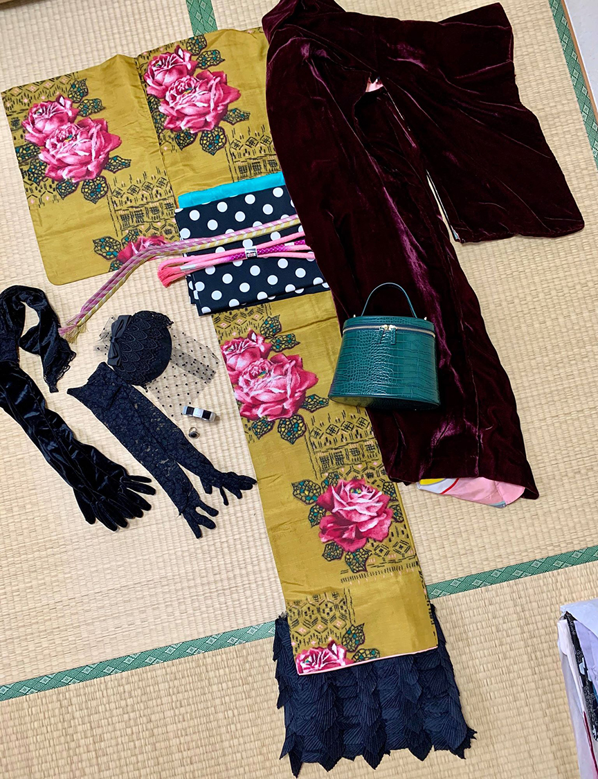 Of course, the kimono was just the start. Putting together a kitsuke outfit is an intricate art – especially when styling a modern kimono hime (“princess kimono”) look and pairing it with Western accessories – so once I’d replied ALL THE YES to her inspired choice, she assembled a constellation of accessories and sent me this:
