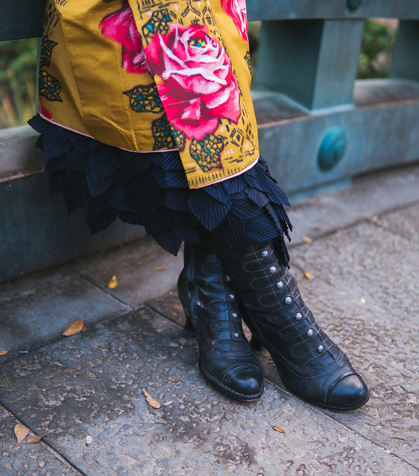 If you’ve ever worn kimono (especially if your forebears came from anywhere outside Asia), you know that there are some challenges to making a garment designed for a Japanese body fit one that’s not. I’m about eight centimeters taller that the average Japanese woman, so kimonos that are the right width (especially vintage kimonos) are always too short. Anji addressed this in an extra-stylish way by adding an Italian pleated fabric to the bottom of the jūban underslip.