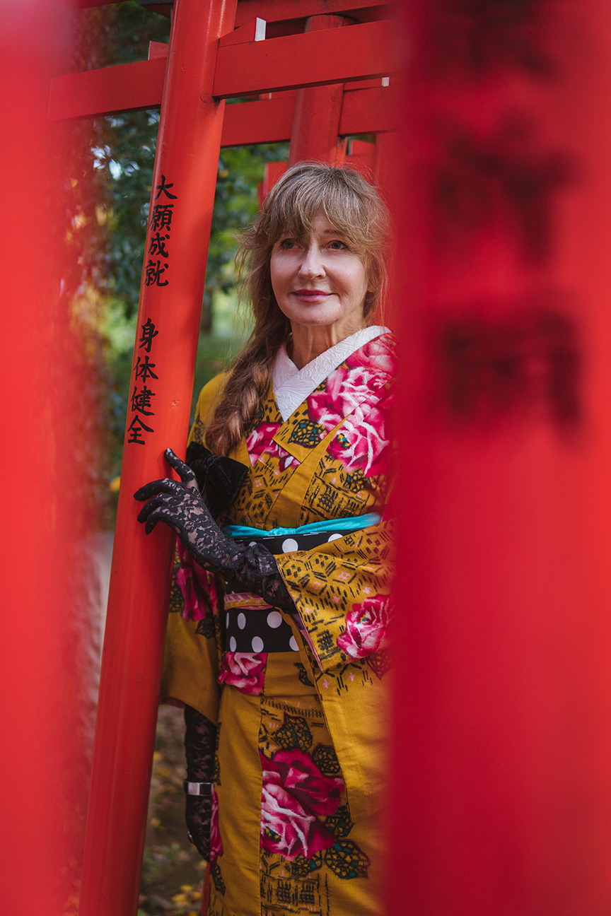 As we walked around the quiet streets she’d scouted for our shoot, we encountered nobody but cats and Japanese locals, who smiled and stopped to tell us how happy they were to see such beautiful kimono outfit being worn about town.