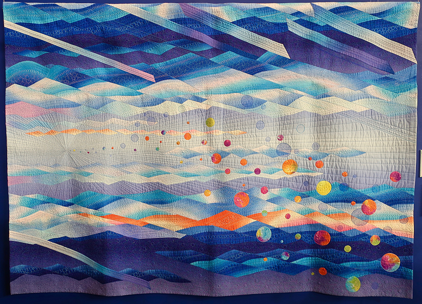 The entrants are international, but many top-notch Japanese artists are represented, working in modern abstract (like this quilt, entitled “Believe IV” by Reiko Nobata, 2019). I mean, it’s not just the dyeing and piecing – check out the amazing intricacies of the quilting itself!