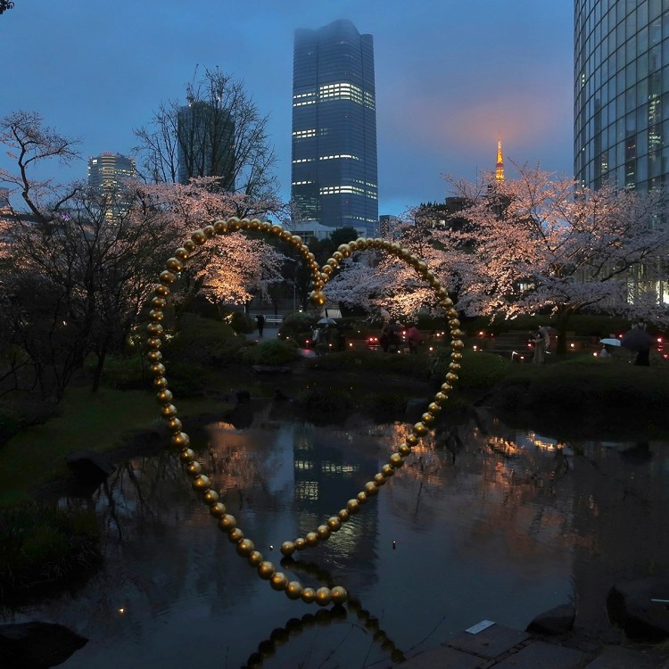 or waves from behind the cherry blossoms in Roppongi’s Mohri Garden during Pinkness Season.