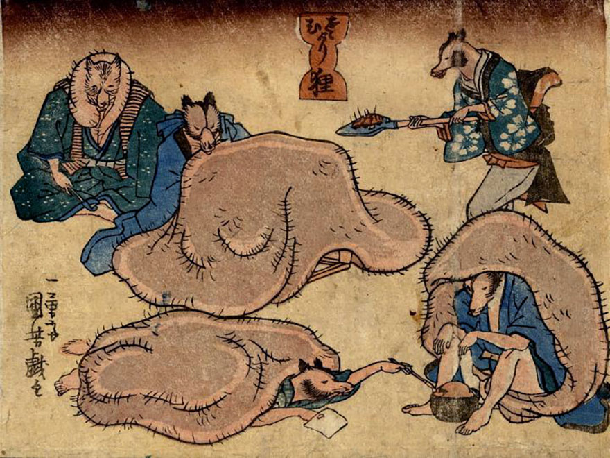 Yeah. Can’t unsee. Now that you know to look, it’s amazing you never noticed before, right? But nobody celebrated these giant gonads more inventively than Edo period artists. You might not think that having a giant hairy ballsack would be a particularly useful body part, but Japanese woodblock artist Kuniyoshi delighted in imagining how the well-endowed tanuki might wield such a gift to its advantage…