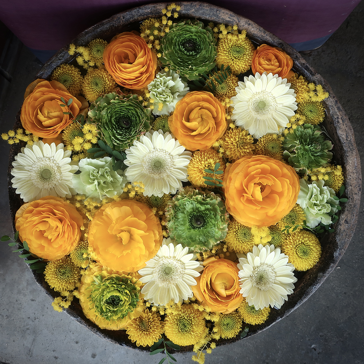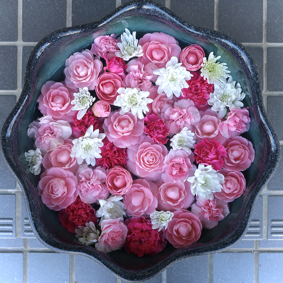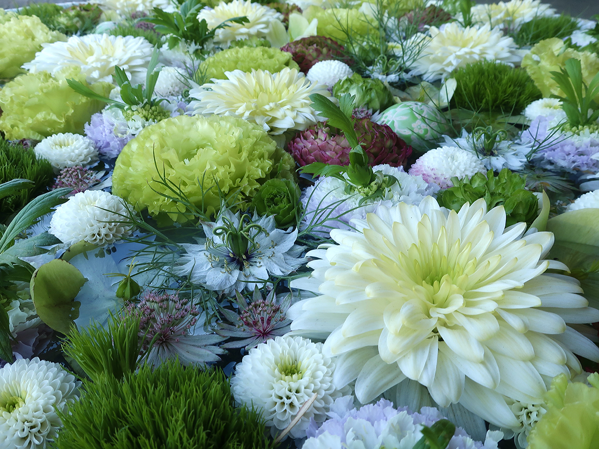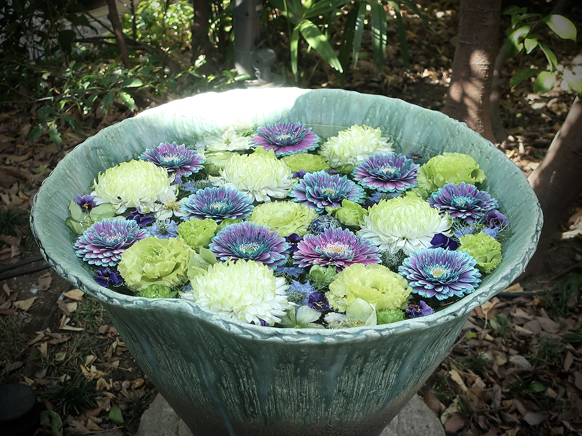 And put together blossoms whose shape and way of growing could never work in a vase, but compliment each other beautifully when floating in a bowl.