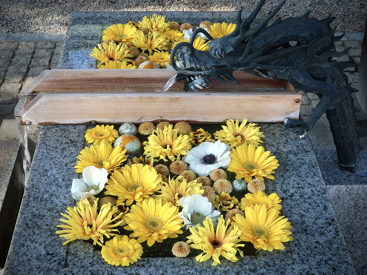 The latest fashion for excess splendor started at shrines that fill their purifying mizu-chōzuya (“hand washing water place”) with a mix of spring blooms and colorful floating balls…