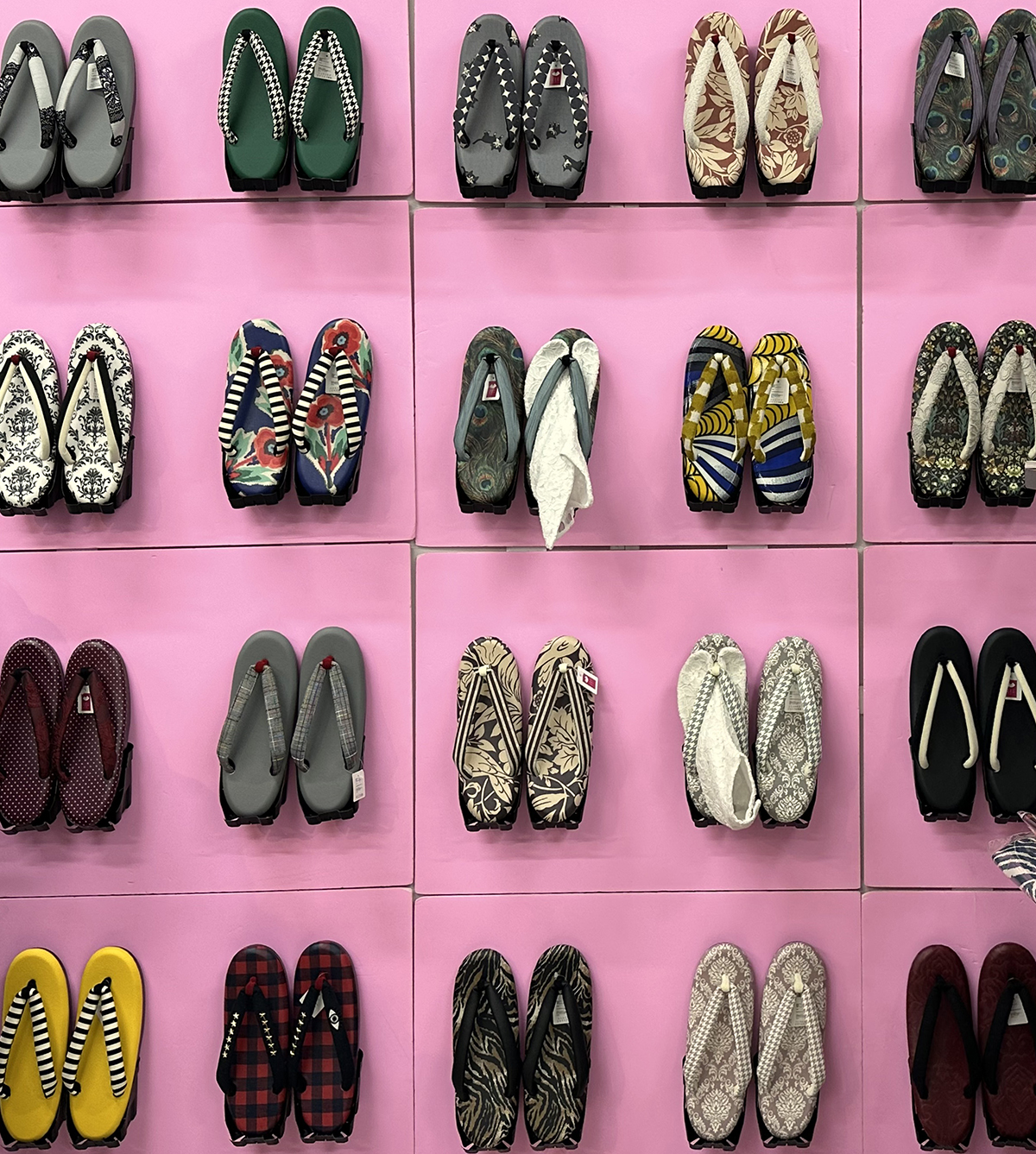 And accessory designers like this one, whose patterned zori add an unexpected layer of kimono coordination delight: when they’re left behind in a no-shoes area, everyone can enjoy how the pattern that’s hidden while you’re wearing them works with the other elements of your outfit.
