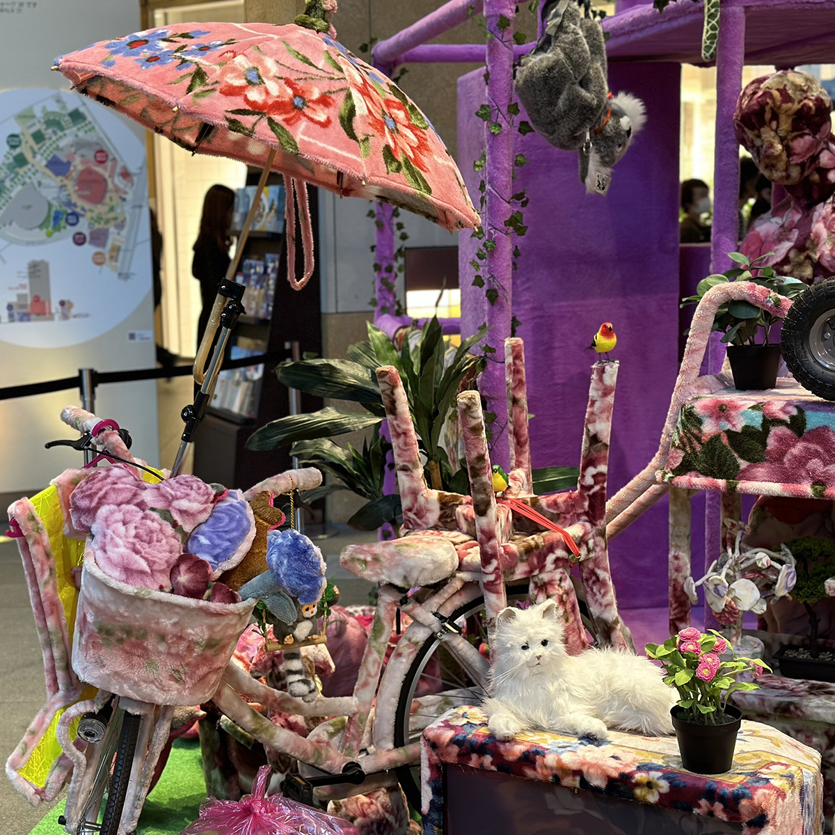 This artist works in the medium of over-the-top floral plush blankets popular in the 1960s, and the work on exhibit featured ordinary household objects (the bicycle was my favorite) completely clad in fluffy floral blanket skins.