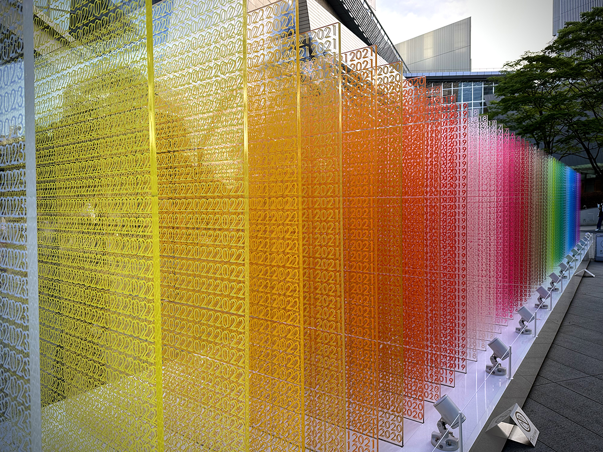 This one by Emmanuelle Moureaux, representing “memory” with its color progression that steps back through the years from 2023, lit up at night for the event…