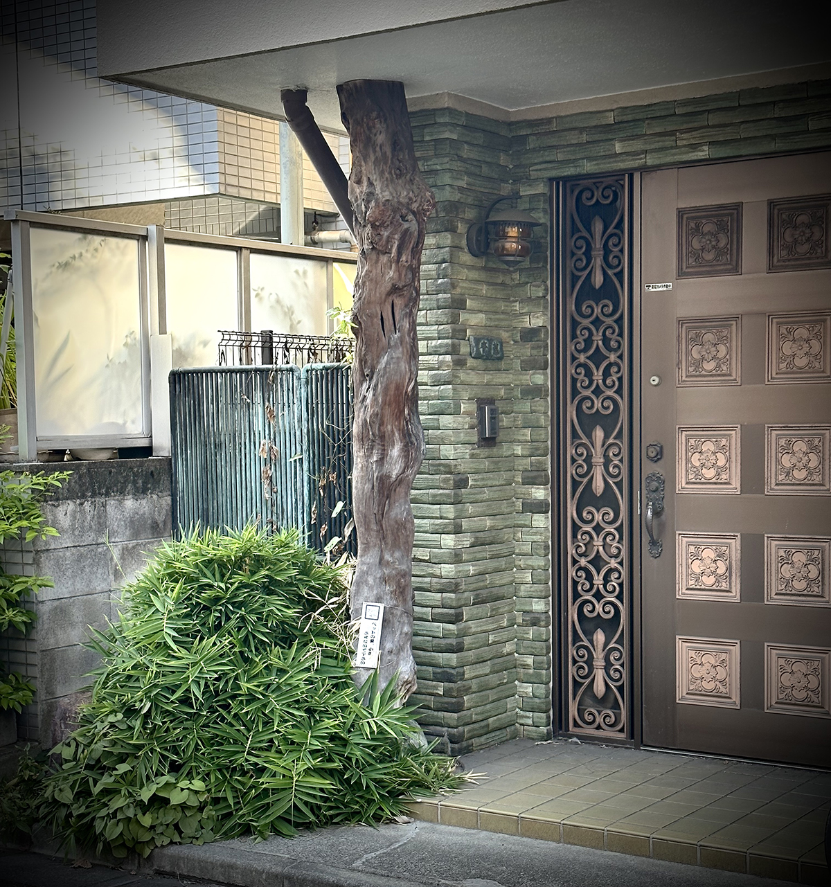 It’s not unusual to find some small traditional remnant of the once-grand Japanese house that used to occupy insanely valuable land that’s now home to a multi-story Tokyo apartment building, but I was still delighted to see this lovely, artfully-gnarled bashira doorpost holding up a portico in the back streets near the Nezu Museum.