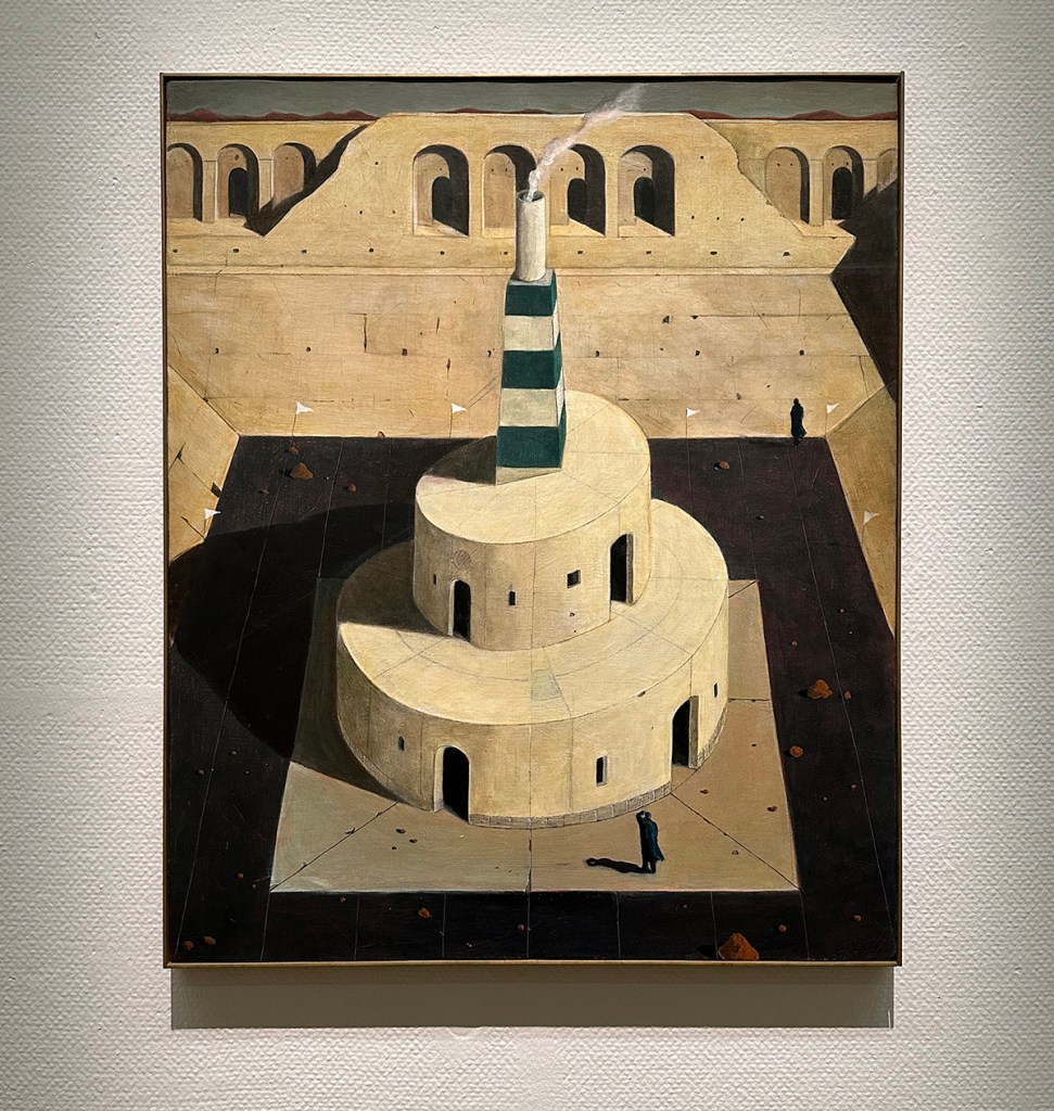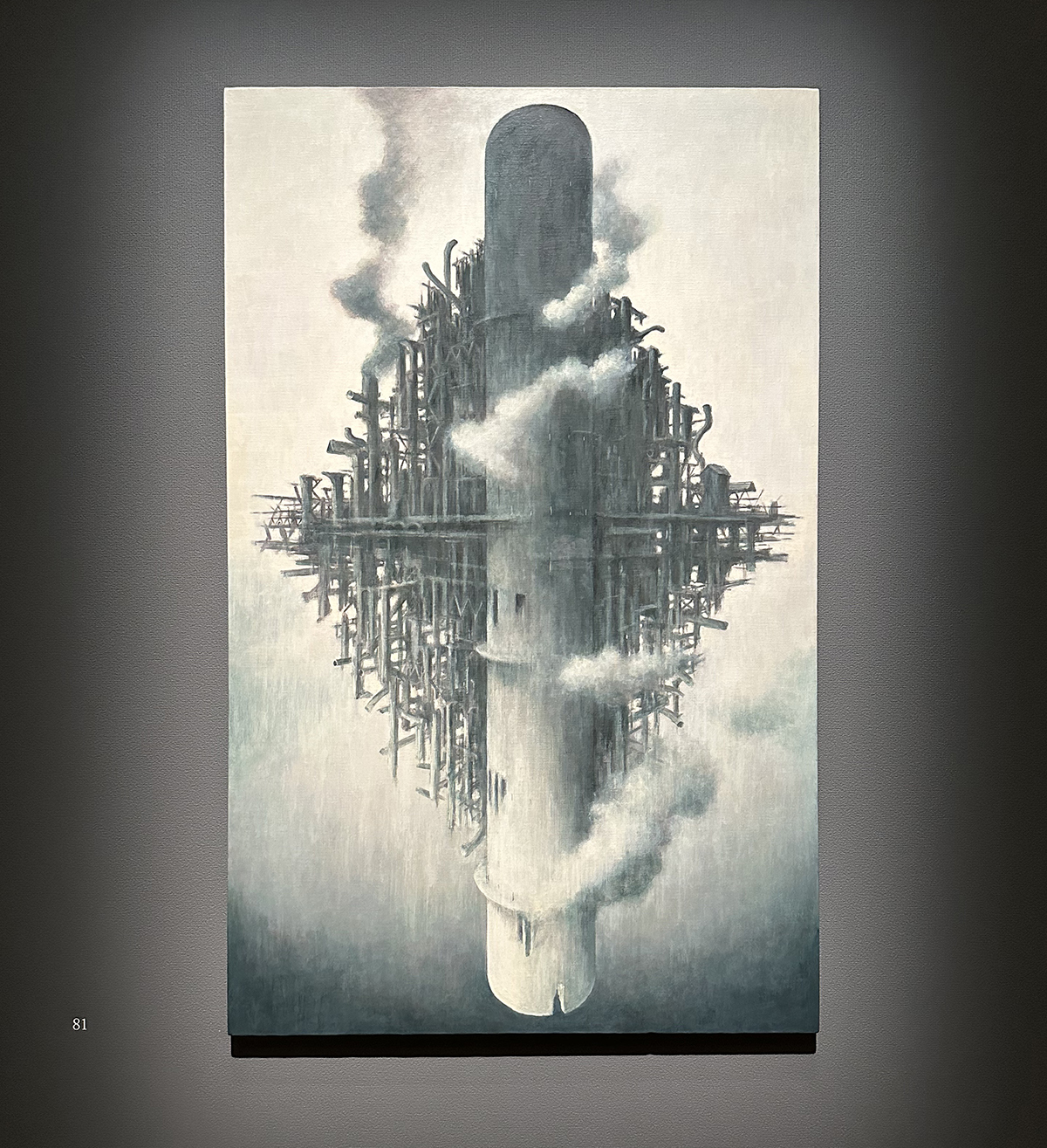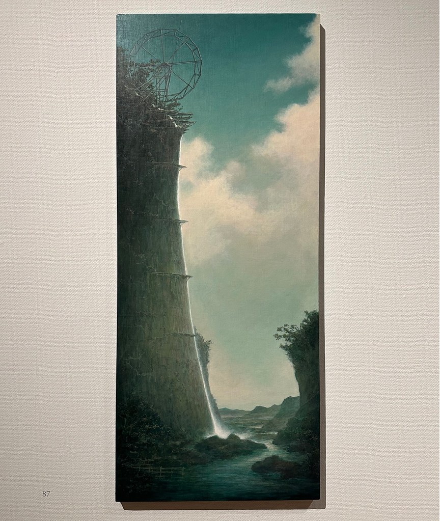 In fact, Nomata was so affected by seeing the structures he painted only a few years before destroyed by the 2011 disaster that he was unable to paint for several years thereafter, and turned out only a handful of works. During that period, his pristine buildings and delicately deadly machinery gave way to images like this one, which appears to be an industrial ruin reflected in still water, but when one looks carefully, the bottom half represents the past, and the top, the post-disaster future.