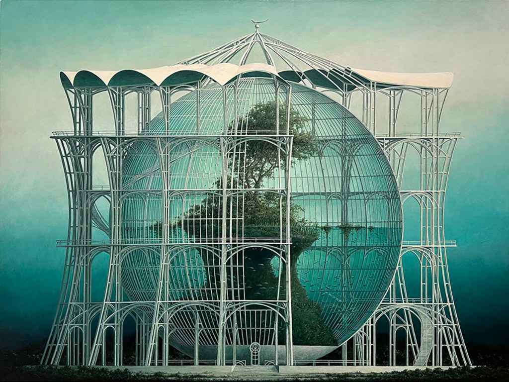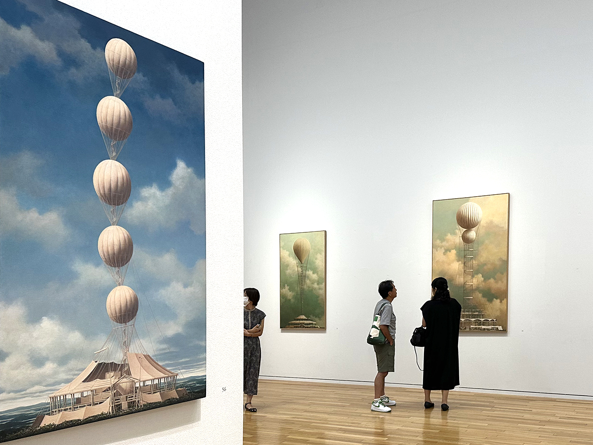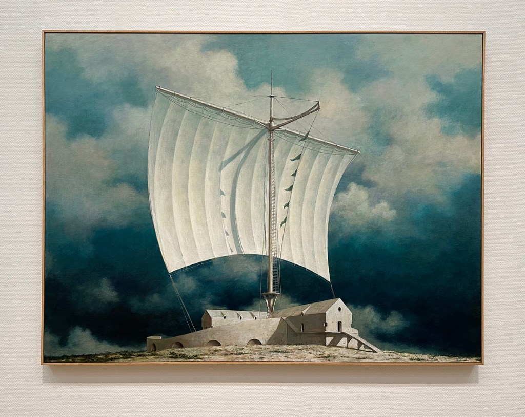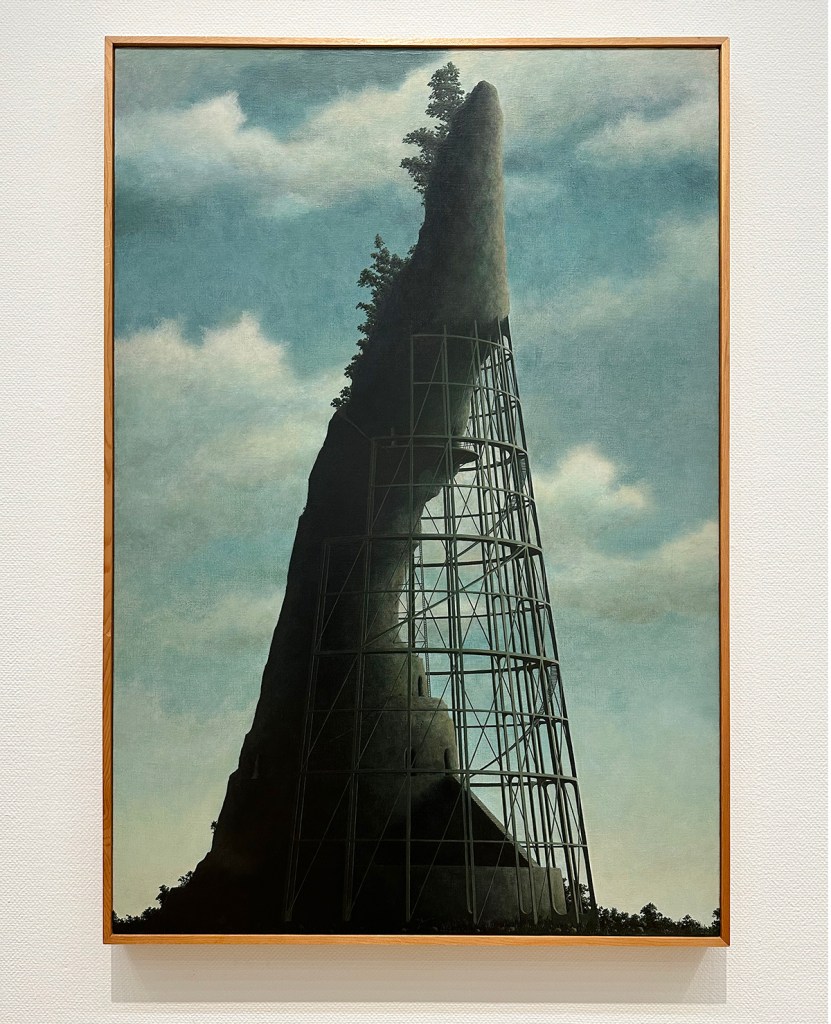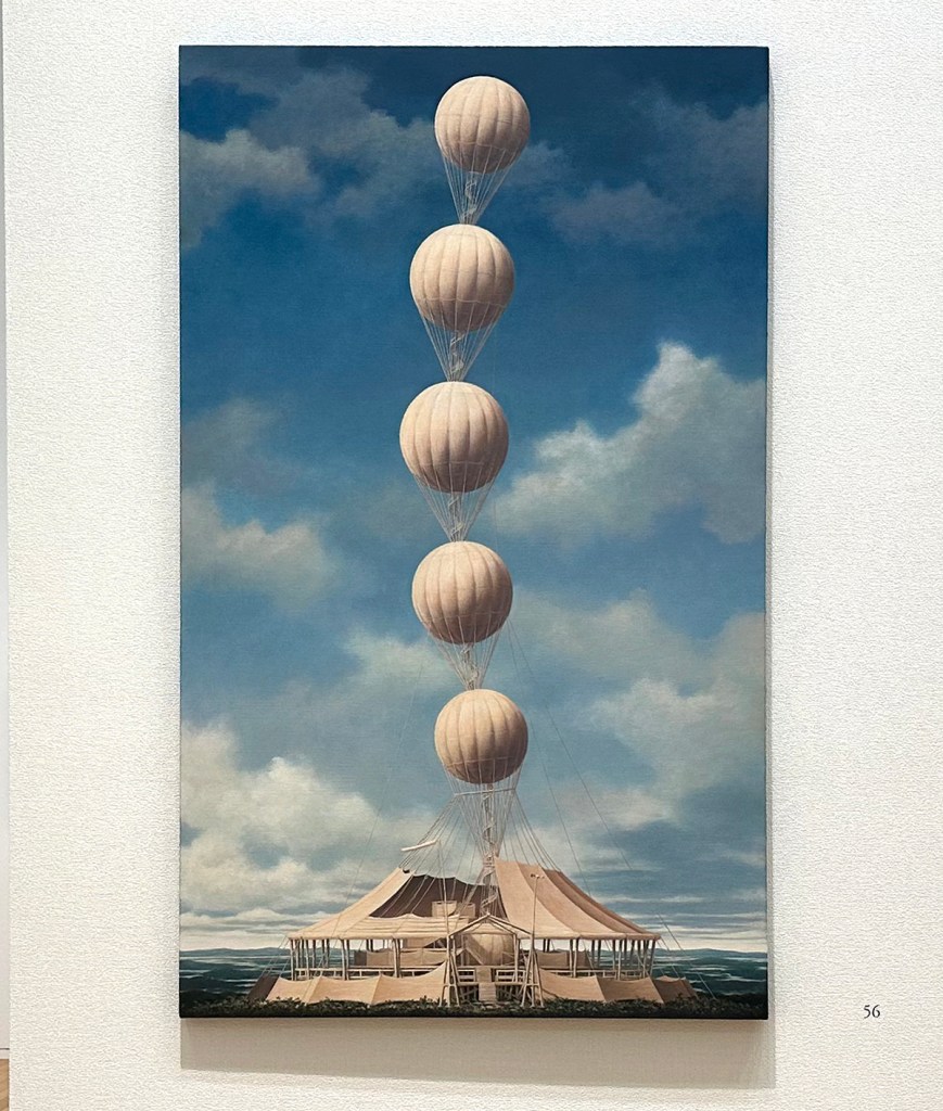 His use of skyscape to enhance a painting’s message becomes even more powerful as he moves on to explore the idea of air being a force like chi, the Asian concept of the life force that circulates within our bodies. His work often contrasts stormy clouds with vistas that are still and silent, and paints puffy, benign clouds behind his most disturbing constructions.