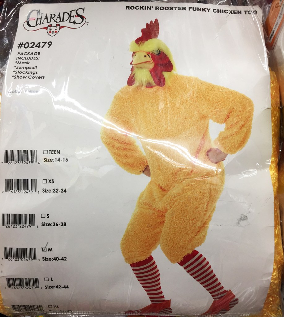 I’m not sure what would possess anyone to dress like a chicken on Halloween, but this is apparently such a popular idea in Japan that there’s more than one take on this dubious costume. To deepen the mystery…those red and white striped socks.