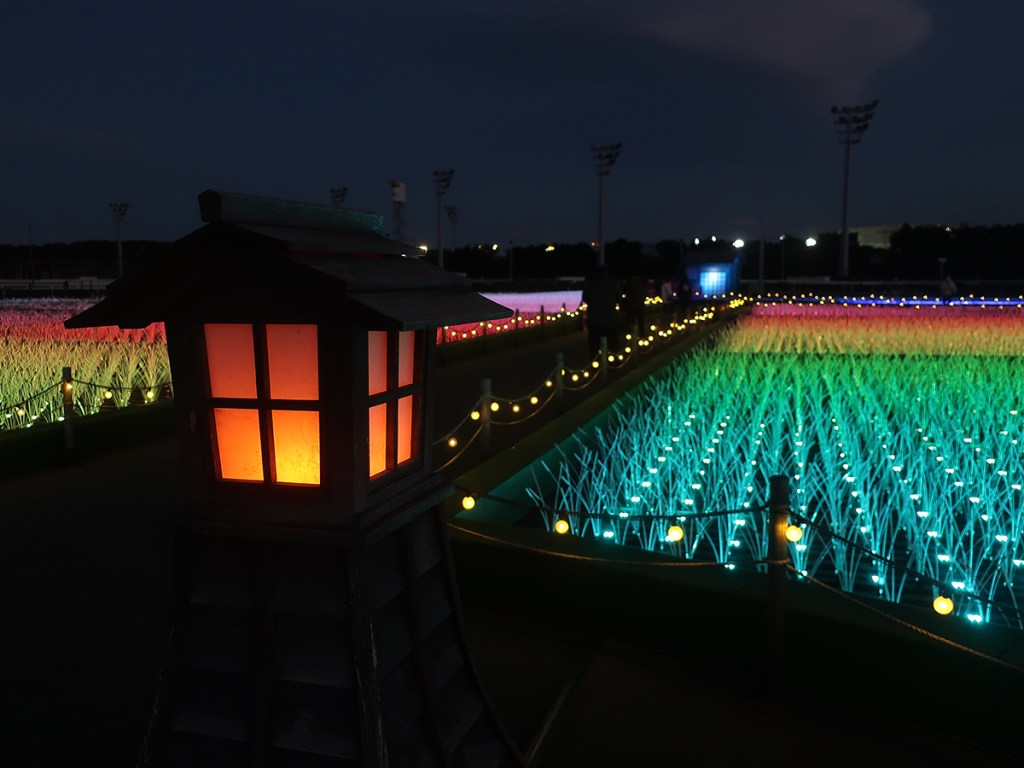 …to glowing, color-changing “rice paddies” that are lit by lanterns and traversed by orange bridges