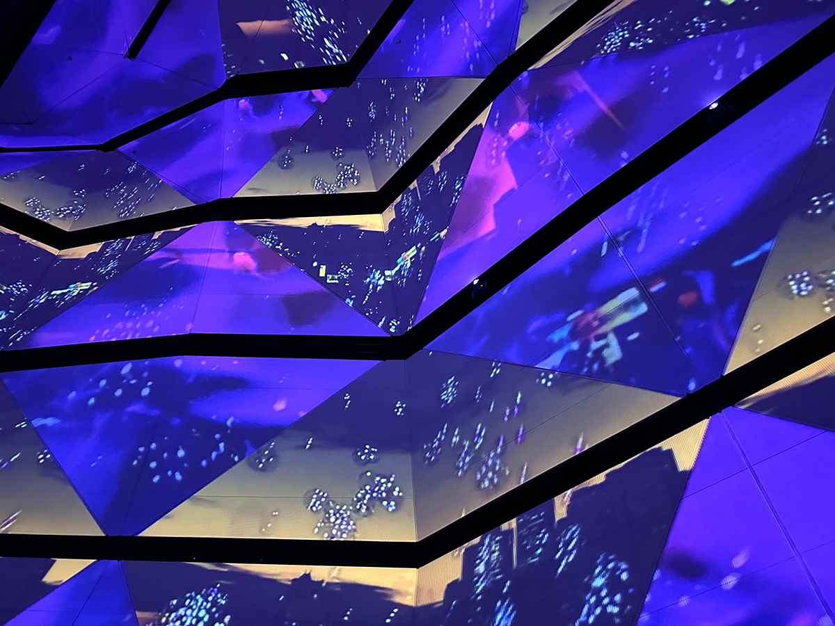 before arriving at a sort of poygonal beehive of a space, where projection mapping juxtapositions of urban scenes and goldfish swim up the walls.