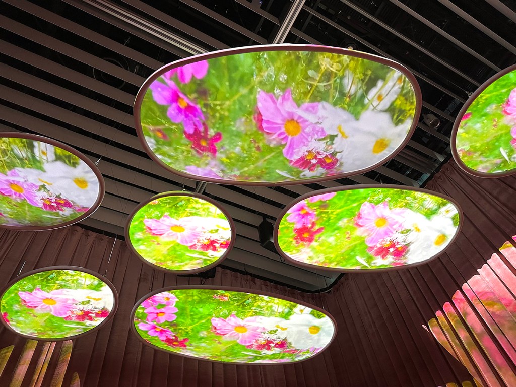 The next room is filled with beanbag seats, so you can lie down and gaze up at the round screens of floral videos…