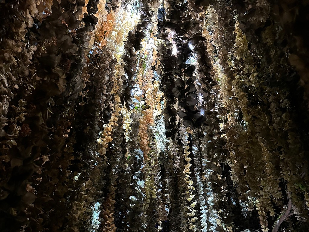 and the first glimpse of flowers is indeed string upon string of what look like dead leis…